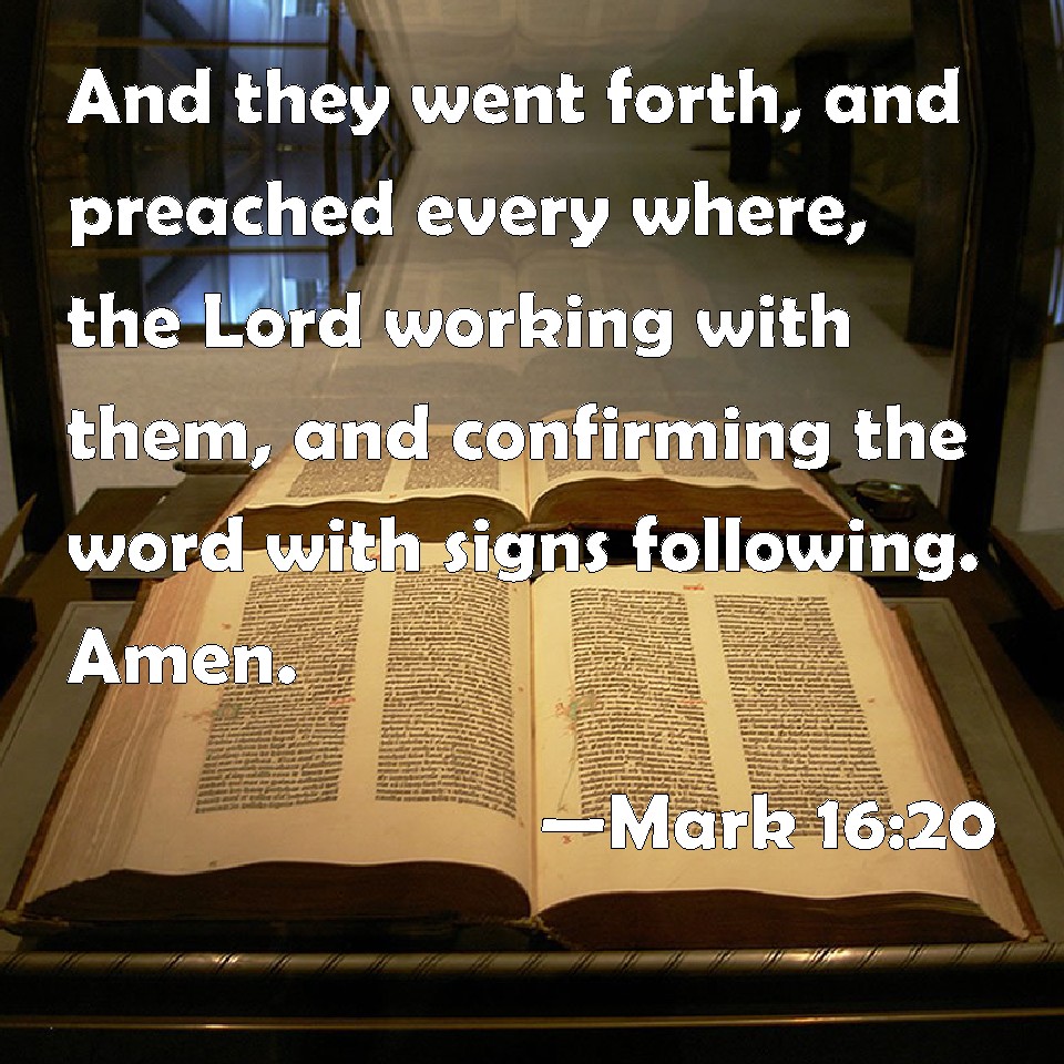 Choose a Background Mark 16:20 And they went forth, and preached every where, the Lord working with them, and confirming the word with signs following. Amen. KJV: And they went forth, and preached every where, the Lord working with them, and confirming the word with signs following. Amen. DRB: But they going forth preached every where: the Lord working withal, and confirming the word with signs that followed. DBT: And they, going forth, preached everywhere, the Lord working with them, and confirming the word by the signs following upon it. ERV: And they went forth, and preached everywhere, the Lord working with them, and confirming the word by the signs that followed. Amen. WBT: And they went forth, and preached every where, the Lord working with them, and confirming the word with signs following. Amen. WEB: They went out, and preached everywhere, the Lord working with them, and confirming the word by the signs that followed. Amen. YLT: and they, having gone forth, did preach everywhere, the Lord working with them, and confirming the word, through the signs following. Amen.Links Mark 16:20 NIV • Mark 16:20 NLT • Mark 16:20 ESV • Mark 16:20 NASB • Mark 16:20 KJV • Mark 16:20 Interlinear • Mark 16:20 Commentaries • Mark 16:20 Parallel Texts • Mark 16:20 Bible Apps • Mark 16:20 Parallel • Bible Hub |