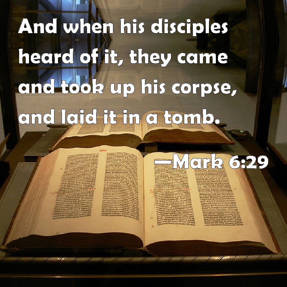 Choose a Background Mark 6:29 And when his disciples heard of it, they came and took up his corpse, and laid it in a tomb. KJV: And when his disciples heard of it, they came and took up his corpse, and laid it in a tomb. DRB: Which his disciples hearing came, and took his body, and laid it in a tomb. DBT: And his disciples having heard it, came and took up his body, and laid it in a tomb. ERV: And when his disciples heard thereof, they came and took up his corpse, and laid it in a tomb. WBT: And when his disciples heard of it, they came and took up his corpse, and laid it in a tomb. WEB: When his disciples heard this, they came and took up his corpse, and laid it in a tomb. YLT: and having heard, his disciples came and took up his corpse, and laid it in the tomb.Links Mark 6:29 NIV • Mark 6:29 NLT • Mark 6:29 ESV • Mark 6:29 NASB • Mark 6:29 KJV • Mark 6:29 Interlinear • Mark 6:29 Commentaries • Mark 6:29 Parallel Texts • Mark 6:29 Bible Apps • Mark 6:29 Parallel • Bible Hub |
