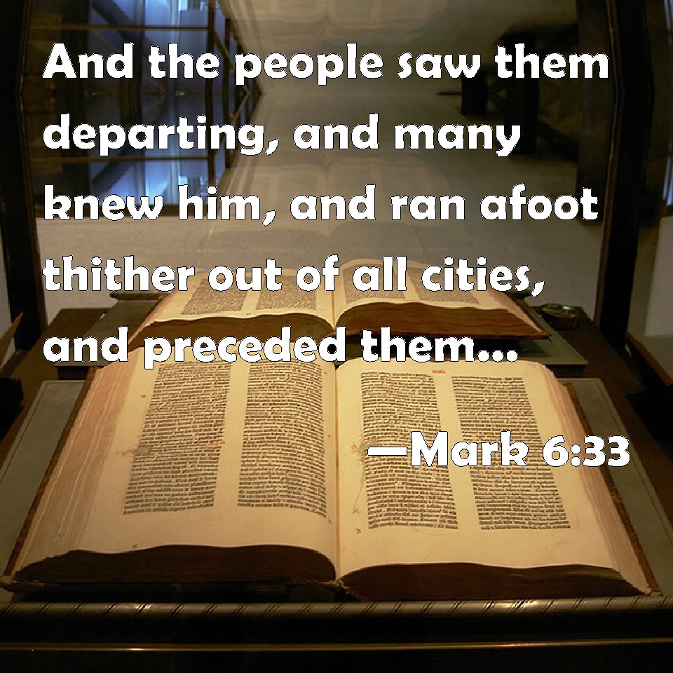Choose a Background Mark 6:33 And the people saw them departing, and many knew him, and ran afoot thither out of all cities, and preceded them, and came together to him. KJV: And the people saw them departing, and many knew him, and ran afoot thither out of all cities, and outwent them, and came together unto him. DRB: And they saw them going away, and many knew: and they ran flocking thither on foot from all the cities, and were there before them. DBT: And many saw them going, and recognised them, and ran together there on foot, out of all the cities, and got there before them. ERV: And the people saw them going, and many knew them, and they ran there together on foot from all the cities, and outwent them. WBT: And the people saw them departing, and many knew him, and ran on foot thither out of all cities, and out went them, and came together to him. WEB: They saw them going, and many recognized him and ran there on foot from all the cities. They arrived before them and came together to him. YLT: And the multitudes saw them going away, and many recognised him, and by land from all the cities they ran thither, and went before them, and came together to him,Links Mark 6:33 NIV • Mark 6:33 NLT • Mark 6:33 ESV • Mark 6:33 NASB • Mark 6:33 KJV • Mark 6:33 Interlinear • Mark 6:33 Commentaries • Mark 6:33 Parallel Texts • Mark 6:33 Bible Apps • Mark 6:33 Parallel • Bible Hub |