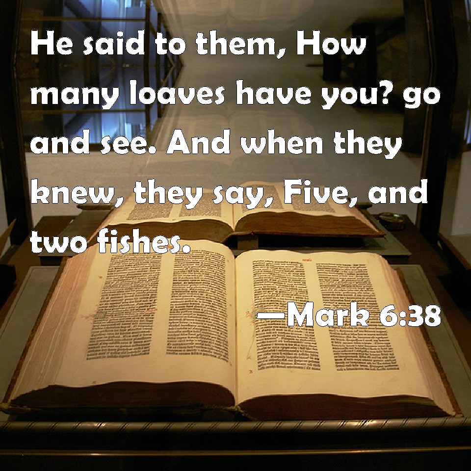 Choose a Background Mark 6:38 He said to them, How many loaves have you? go and see. And when they knew, they say, Five, and two fishes. KJV: He saith unto them, How many loaves have ye? go and see. And when they knew, they say, Five, and two fishes. DRB: And he saith to them: How many loaves have you? go and see. And when they knew, they say: Five, and two fishes DBT: And he says to them, How many loaves have ye? Go and see. And when they knew they say, Five, and two fishes. ERV: And he saith unto them, How many loaves have ye? go and see. And when they knew, they say, Five, and two fishes. WBT: He saith to them, How many loaves have ye? go and see. And when they knew, they say, Five, and two fishes. WEB: He said to them, "How many loaves do you have? Go see." When they knew, they said, "Five, and two fish." YLT: And he saith to them, 'How many loaves have ye? go and see;' and having known, they say, 'Five, and two fishes.'Links Mark 6:38 NIV • Mark 6:38 NLT • Mark 6:38 ESV • Mark 6:38 NASB • Mark 6:38 KJV • Mark 6:38 Interlinear • Mark 6:38 Commentaries • Mark 6:38 Parallel Texts • Mark 6:38 Bible Apps • Mark 6:38 Parallel • Bible Hub |