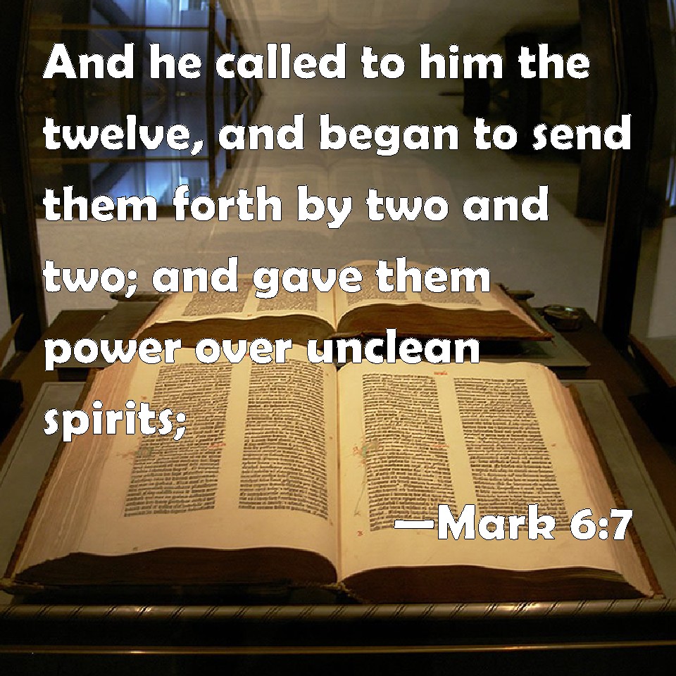 Choose a Background Mark 6:7 And he called to him the twelve, and began to send them forth by two and two; and gave them power over unclean spirits; KJV: And he called unto him the twelve, and began to send them forth by two and two; and gave them power over unclean spirits; DRB: And he called the twelve; and began to send them two and two, and gave them power over unclean spirits. DBT: And he calls the twelve to him; and he began to send them out two and two, and gave to them power over the unclean spirits; ERV: And he called unto him the twelve, and began to send them forth by two and two; and he gave them authority over the unclean spirits; WBT: And he calleth to him the twelve, and began to send them forth by two and two; and gave them power over unclean spirits; WEB: He called to himself the twelve, and began to send them out two by two; and he gave them authority over the unclean spirits. YLT: and he doth call near the twelve, and he began to send them forth two by two, and he was giving them power over the unclean spirits,Links Mark 6:7 NIV • Mark 6:7 NLT • Mark 6:7 ESV • Mark 6:7 NASB • Mark 6:7 KJV • Mark 6:7 Interlinear • Mark 6:7 Commentaries • Mark 6:7 Parallel Texts • Mark 6:7 Bible Apps • Mark 6:7 Parallel • Bible Hub |