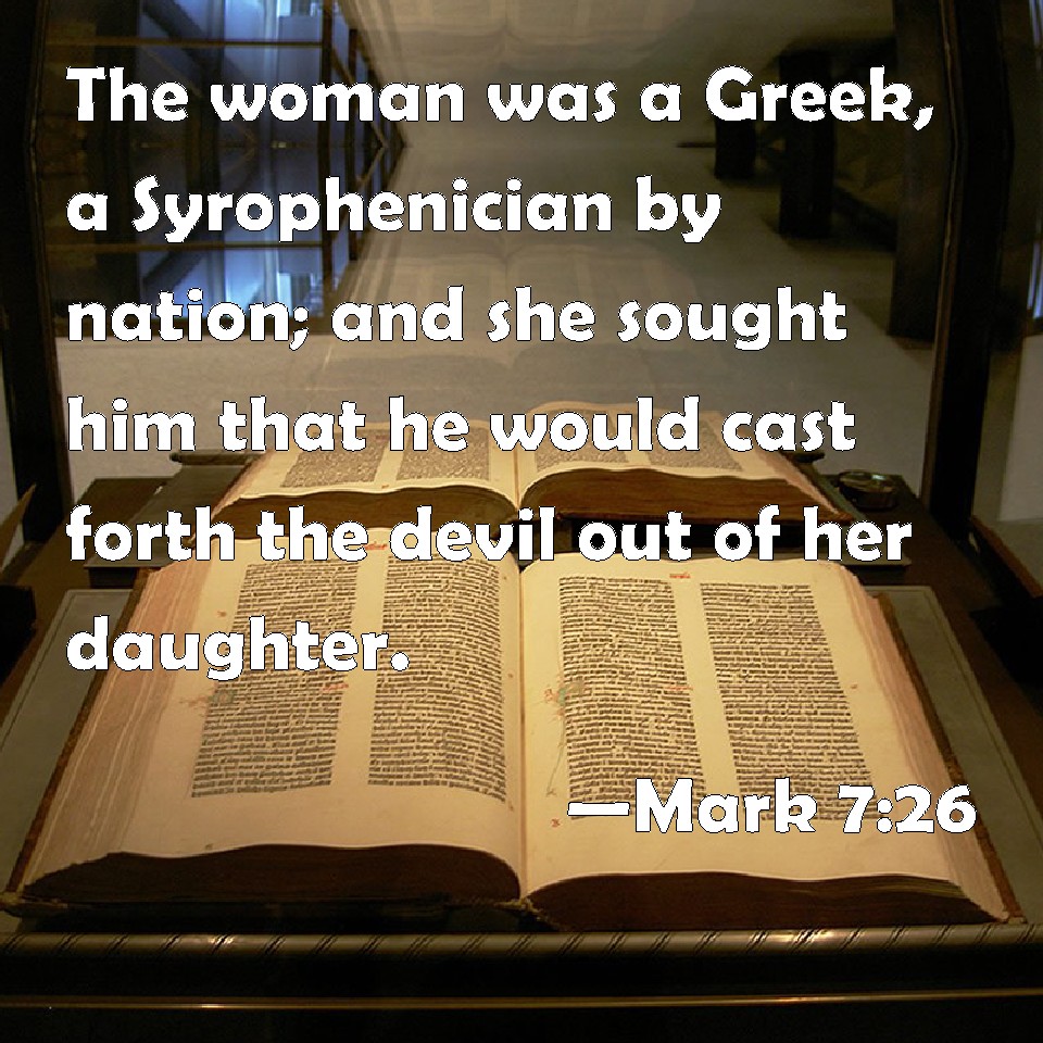 Choose a Background Mark 7:26 The woman was a Greek, a Syrophenician by nation; and she sought him that he would cast forth the devil out of her daughter. KJV: The woman was a Greek, a Syrophenician by nation; and she besought him that he would cast forth the devil out of her daughter. DRB: For the woman was a Gentile, a Syrophenician born. And she besought him that he would cast forth the devil out of her daughter. DBT: (and the woman was a Greek, Syrophenician by race), and asked him that he would cast the demon out of her daughter. ERV: Now the woman was a Greek, a Syrophoenician by race. And she besought him that he would cast forth the devil out of her daughter. WBT: (The woman was a Greek, a Syrophenician by nation,) and she besought him that he would cast forth the demon out of her daughter. WEB: Now the woman was a Greek, a Syrophoenician by race. She begged him that he would cast the demon out of her daughter. YLT: and the woman was a Greek, a Syro-Phenician by nation — and was asking him, that the demon he may cast forth out of her daughter.Links Mark 7:26 NIV • Mark 7:26 NLT • Mark 7:26 ESV • Mark 7:26 NASB • Mark 7:26 KJV • Mark 7:26 Interlinear • Mark 7:26 Commentaries • Mark 7:26 Parallel Texts • Mark 7:26 Bible Apps • Mark 7:26 Parallel • Bible Hub |