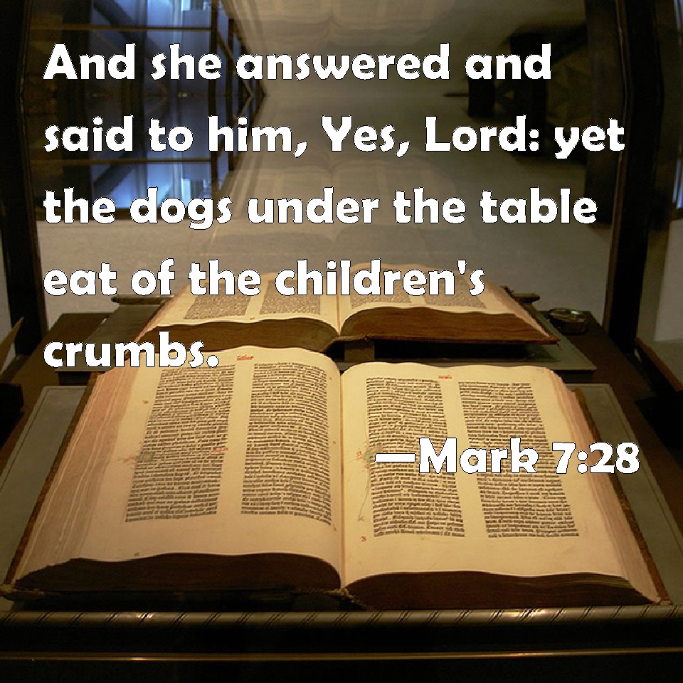 Choose a Background Mark 7:28 And she answered and said to him, Yes, Lord: yet the dogs under the table eat of the children's crumbs. KJV: And she answered and said unto him, Yes, Lord: yet the dogs under the table eat of the children's crumbs. DRB: But she answered and said to him: Yea, Lord; for the whelps also eat under the table of the crumbs of the children. DBT: But she answered and says to him, Yea, Lord; for even the dogs under the table eat of the children's crumbs. ERV: But she answered and saith unto him, Yea, Lord: even the dogs under the table eat of the children's crumbs. WBT: And she answered and said to him, Yes, Lord: yet the dogs under the table eat of the children's crums. WEB: But she answered him, "Yes, Lord. Yet even the dogs under the table eat the children's crumbs." YLT: And she answered and saith to him, 'Yes, sir; for the little dogs also under the table do eat of the children's crumbs.'Links Mark 7:28 NIV • Mark 7:28 NLT • Mark 7:28 ESV • Mark 7:28 NASB • Mark 7:28 KJV • Mark 7:28 Interlinear • Mark 7:28 Commentaries • Mark 7:28 Parallel Texts • Mark 7:28 Bible Apps • Mark 7:28 Parallel • Bible Hub |