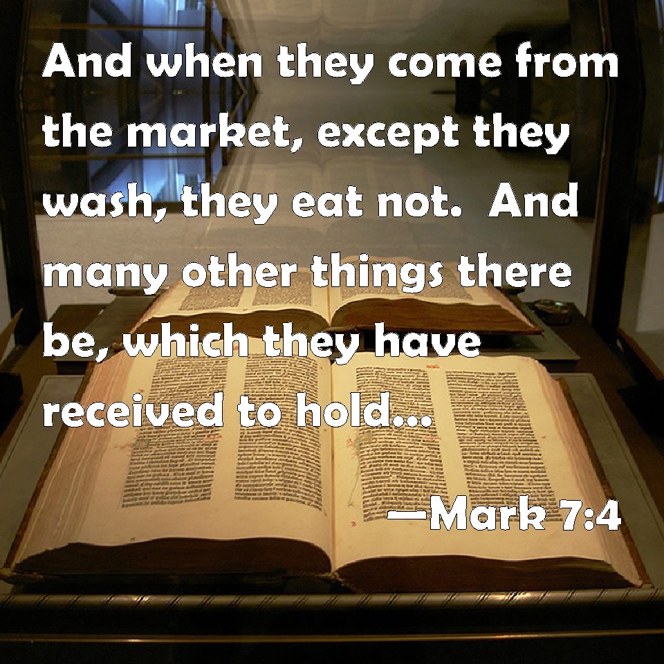Choose a Background Mark 7:4 And when they come from the market, except they wash, they eat not. And many other things there be, which they have received to hold, as the washing of cups, and pots, brazen vessels, and of tables. KJV: And when they come from the market, except they wash, they eat not. And many other things there be, which they have received to hold, as the washing of cups, and pots, brasen vessels, and of tables. DRB: And when they come from the market, unless they be washed, they eat not: and many other things there are that have been delivered to them to observe, the washings of cups and of pots, and of brazen vessels, and of beds. DBT: and on coming from the market-place, unless they are washed, they do not eat; and there are many other things which they have received to hold, the washing of cups and vessels, and brazen utensils, and couches), ERV: and when they come from the marketplace, except they wash themselves, they eat not: and many other things there be, which they have received to hold, washings of cups, and pots, and brasen vessels. WBT: And when they come from the market, except they wash, they eat not. And many other things there are, which they have received to hold, as the washing of cups, and pots, and of brazen vessels, and tables. WEB: They don't eat when they come from the marketplace, unless they bathe themselves, and there are many other things, which they have received to hold to: washings of cups, pitchers, bronze vessels, and couches.) YLT: and, coming from the market-place, if they do not baptize themselves, they do not eat; and many other things there are that they received to hold, baptisms of cups, and pots, and brazen vessels, and couches.Links Mark 7:4 NIV • Mark 7:4 NLT • Mark 7:4 ESV • Mark 7:4 NASB • Mark 7:4 KJV • Mark 7:4 Interlinear • Mark 7:4 Commentaries • Mark 7:4 Parallel Texts • Mark 7:4 Bible Apps • Mark 7:4 Parallel • Bible Hub |