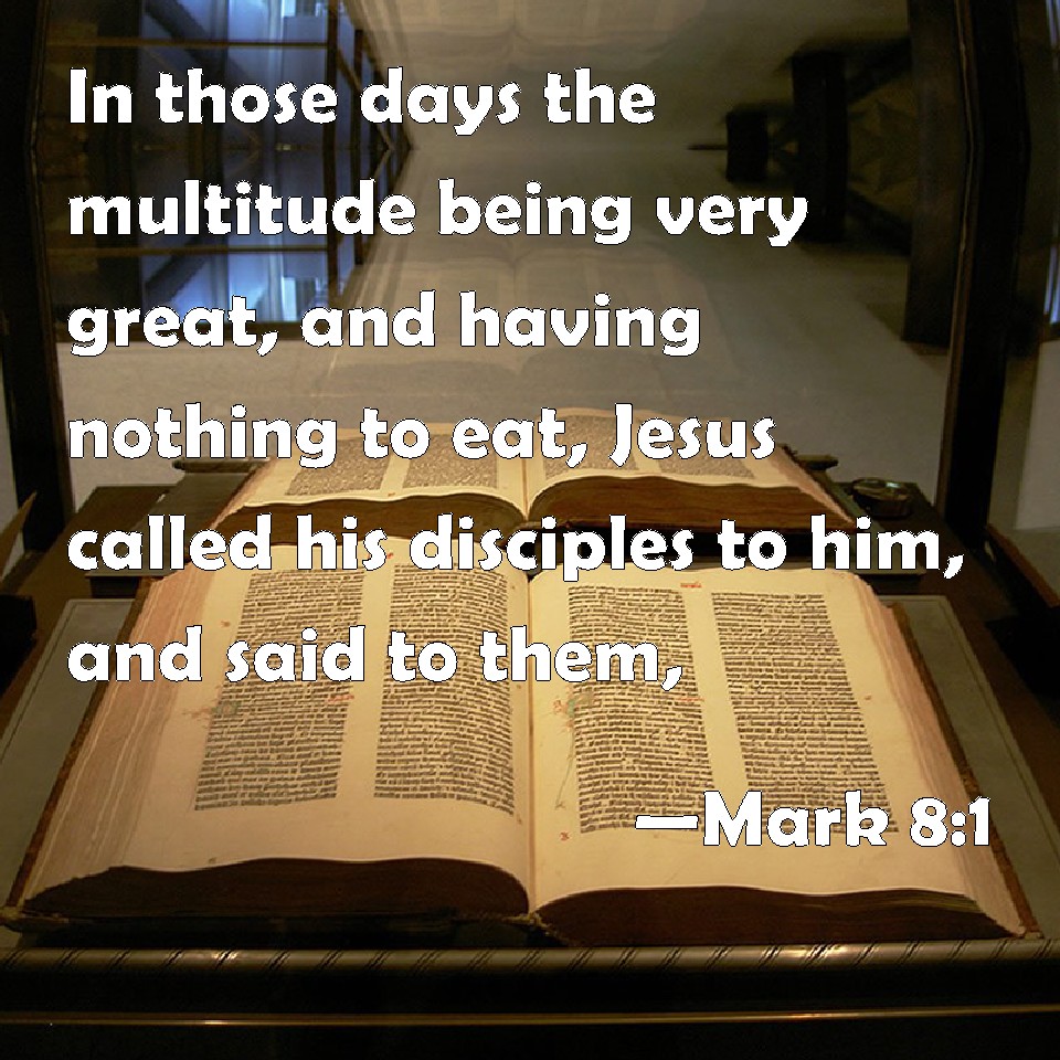 Choose a Background Mark 8:1 In those days the multitude being very great, and having nothing to eat, Jesus called his disciples to him, and said to them, KJV: In those days the multitude being very great, and having nothing to eat, Jesus called his disciples unto him, and saith unto them, DRB: IN those days again, when there was a great multitude, and had nothing to eat; calling his disciples together, he saith to them: DBT: In those days, there being again a great crowd, and they having nothing that they could eat, having called his disciples to him, he says to them, ERV: In those days, when there was again a great multitude, and they had nothing to eat, he called unto him his disciples, and saith unto them, WBT: In those days the multitude being very great, and having nothing to eat, Jesus called his disciples, and saith to them, WEB: In those days, when there was a very great multitude, and they had nothing to eat, Jesus called his disciples to himself, and said to them, YLT: In those days the multitude being very great, and not having what they may eat, Jesus having called near his disciples, saith to them,Links Mark 8:1 NIV • Mark 8:1 NLT • Mark 8:1 ESV • Mark 8:1 NASB • Mark 8:1 KJV • Mark 8:1 Interlinear • Mark 8:1 Commentaries • Mark 8:1 Parallel Texts • Mark 8:1 Bible Apps • Mark 8:1 Parallel • Bible Hub |