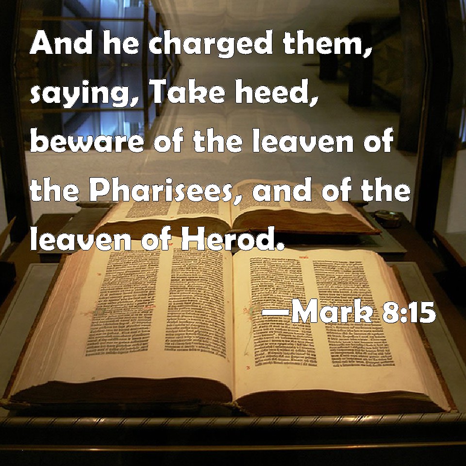 Choose a Background Mark 8:15 And he charged them, saying, Take heed, beware of the leaven of the Pharisees, and of the leaven of Herod. KJV: And he charged them, saying, Take heed, beware of the leaven of the Pharisees, and of the leaven of Herod. DRB: And he charged them, saying: Take heed and beware of the leaven of the Pharisees, and of the leaven of Herod. DBT: And he charged them, saying, Take heed, beware of the leaven of the Pharisees and of the leaven of Herod. ERV: And he charged them, saying, Take heed, beware of the leaven of the Pharisees and the leaven of Herod. WBT: And he charged them saying, Take heed, beware of the leaven of the Pharisees, and of the leaven of Herod. WEB: He warned them, saying, "Take heed: beware of the yeast of the Pharisees and the yeast of Herod." YLT: and he was charging them, saying, 'Take heed, beware of the leaven of the Pharisees, and of the leaven of Herod,'Links Mark 8:15 NIV • Mark 8:15 NLT • Mark 8:15 ESV • Mark 8:15 NASB • Mark 8:15 KJV • Mark 8:15 Interlinear • Mark 8:15 Commentaries • Mark 8:15 Parallel Texts • Mark 8:15 Bible Apps • Mark 8:15 Parallel • Bible Hub |