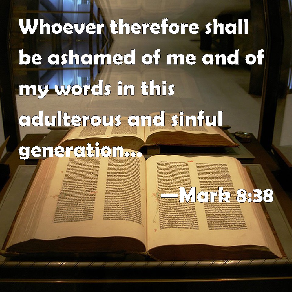 Choose a Background Mark 8:38 Whoever therefore shall be ashamed of me and of my words in this adulterous and sinful generation; of him also shall the Son of man be ashamed, when he comes in the glory of his Father with the holy angels. KJV: Whosoever therefore shall be ashamed of me and of my words in this adulterous and sinful generation; of him also shall the Son of man be ashamed, when he cometh in the glory of his Father with the holy angels. DRB: For he that shall be ashamed of me, and of my words, in this adulterous and sinful generation: the Son of man also will be ashamed of him, when he shall come in the glory of his Father with the holy angels. DBT: For whosoever shall be ashamed of me and of my words in this adulterous and sinful generation, of him shall the Son of man also be ashamed when he shall come in the glory of his Father with the holy angels. ERV: For whosoever shall be ashamed of me and of my words in this adulterous and sinful generation, the Son of man also shall be ashamed of him, when he cometh in the glory of his Father with the holy angels. WBT: Whoever therefore shall be ashamed of me, and of my words, in this adulterous and sinful generation; of him also will the Son of man be ashamed, when he cometh in the glory of his Father with the holy angels. WEB: For whoever will be ashamed of me and of my words in this adulterous and sinful generation, the Son of Man also will be ashamed of him, when he comes in the glory of his Father with the holy angels." YLT: for whoever may be ashamed of me, and of my words, in this adulterous and sinful generation, the Son of Man also shall be ashamed of him, when he may come in the glory of his Father, with the holy messengers.'Links Mark 8:38 NIV • Mark 8:38 NLT • Mark 8:38 ESV • Mark 8:38 NASB • Mark 8:38 KJV • Mark 8:38 Interlinear • Mark 8:38 Commentaries • Mark 8:38 Parallel Texts • Mark 8:38 Bible Apps • Mark 8:38 Parallel • Bible Hub |