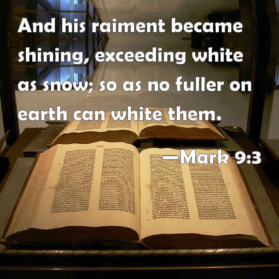 Choose a Background Mark 9:3 And his raiment became shining, exceeding white as snow; so as no fuller on earth can white them. KJV: And his raiment became shining, exceeding white as snow; so as no fuller on earth can white them. DRB: And his garments became shining and exceeding white as snow, so as no fuller upon earth can make white. DBT: and his garments became shining, exceeding white as snow, such as fuller on earth could not whiten them. ERV: and his garments became glistering, exceeding white; so as no fuller on earth can whiten them. WBT: And his raiment became shining, exceeding white as snow; so as no fuller on earth can whiten them. WEB: His clothing became glistening, exceedingly white, like snow, such as no launderer on earth can whiten them. YLT: and his garments became glittering, white exceedingly, as snow, so as a fuller upon the earth is not able to whiten them.Links Mark 9:3 NIV • Mark 9:3 NLT • Mark 9:3 ESV • Mark 9:3 NASB • Mark 9:3 KJV • Mark 9:3 Interlinear • Mark 9:3 Commentaries • Mark 9:3 Parallel Texts • Mark 9:3 Bible Apps • Mark 9:3 Parallel • Bible Hub |