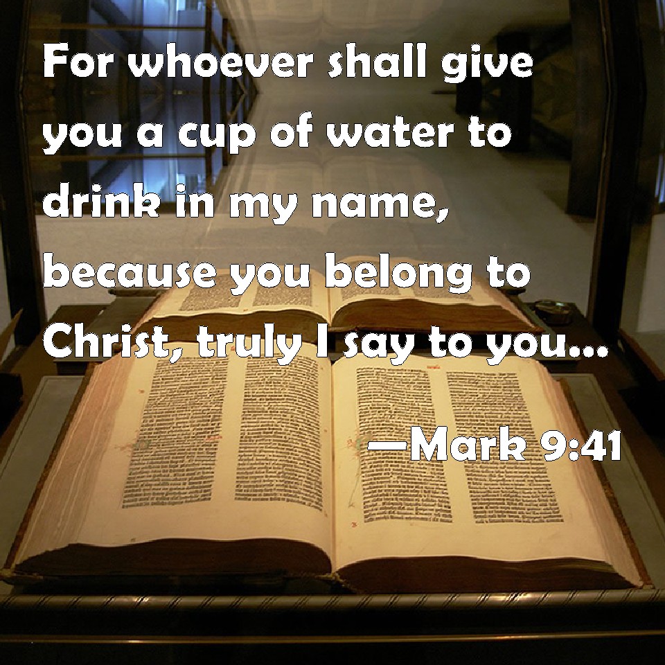 Choose a Background Mark 9:41 For whoever shall give you a cup of water to drink in my name, because you belong to Christ, truly I say to you, he shall not lose his reward. KJV: For whosoever shall give you a cup of water to drink in my name, because ye belong to Christ, verily I say unto you, he shall not lose his reward. DRB: For whosoever shall give you to drink a cup of water in my name, because you belong to Christ: amen I say to you, he shall not lose his reward. DBT: For whosoever shall give you a cup of water to drink in my name, because ye are Christ's, verily I say unto you, he shall in no wise lose his reward. ERV: For whosoever shall give you a cup of water to drink, because ye are Christ's, verily I say unto you, he shall in no wise lose his reward. WBT: For whoever shall give you a cup of water to drink in my name, because ye belong to Christ, verily I say to you, he shall not lose his reward. WEB: For whoever will give you a cup of water to drink in my name, because you are Christ's, most certainly I tell you, he will in no way lose his reward. YLT: for whoever may give you to drink a cup of water in my name, because ye are Christ's, verily I say to you, he may not lose his reward;Links Mark 9:41 NIV • Mark 9:41 NLT • Mark 9:41 ESV • Mark 9:41 NASB • Mark 9:41 KJV • Mark 9:41 Interlinear • Mark 9:41 Commentaries • Mark 9:41 Parallel Texts • Mark 9:41 Bible Apps • Mark 9:41 Parallel • Bible Hub |