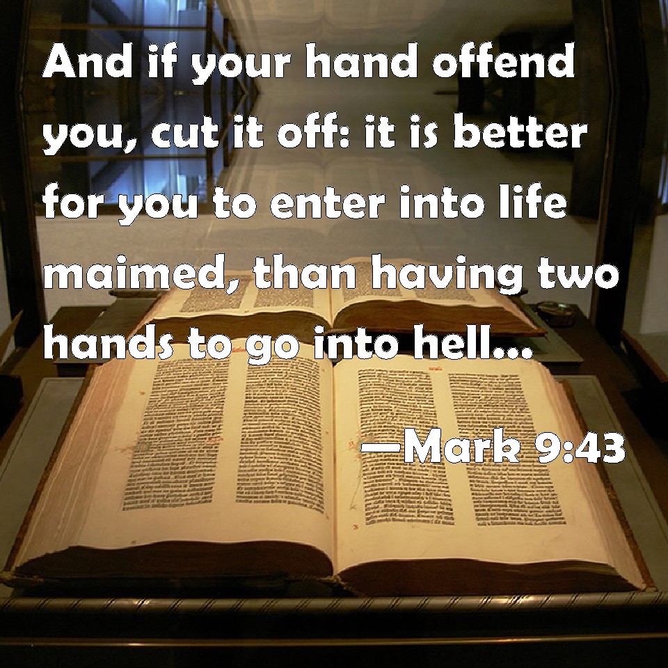 Choose a Background Mark 9:43 And if your hand offend you, cut it off: it is better for you to enter into life maimed, than having two hands to go into hell, into the fire that never shall be quenched: KJV: And if thy hand offend thee, cut it off: it is better for thee to enter into life maimed, than having two hands to go into hell, into the fire that never shall be quenched: DRB: And if thy hand scandalize thee, cut it off: it is better for thee to enter into life, maimed, than having two hands to go into hell, into unquenchable fire: DBT: And if thy hand serve as a snare to thee, cut it off: it is better for thee to enter into life maimed, than having thy two hands to go away into hell, into the fire unquenchable; ERV: And if thy hand cause thee to stumble, cut it off: it is good for thee to enter into life maimed, rather than having thy two hands to go into hell, into the unquenchable fire. WBT: And if thy hand causeth thee to fall into sin, cut it off: it is better for thee to enter life maimed, than having two hands to go into hell, into the fire that never shall be quenched: WEB: If your hand causes you to stumble, cut it off. It is better for you to enter into life maimed, rather than having your two hands to go into Gehenna, into the unquenchable fire, YLT: And if thy hand may cause thee to stumble, cut it off; it is better for thee maimed to enter into the life, than having the two hands, to go away to the gehenna, to the fire — the unquenchable — Links Mark 9:43 NIV • Mark 9:43 NLT • Mark 9:43 ESV • Mark 9:43 NASB • Mark 9:43 KJV • Mark 9:43 Interlinear • Mark 9:43 Commentaries • Mark 9:43 Parallel Texts • Mark 9:43 Bible Apps • Mark 9:43 Parallel • Bible Hub |