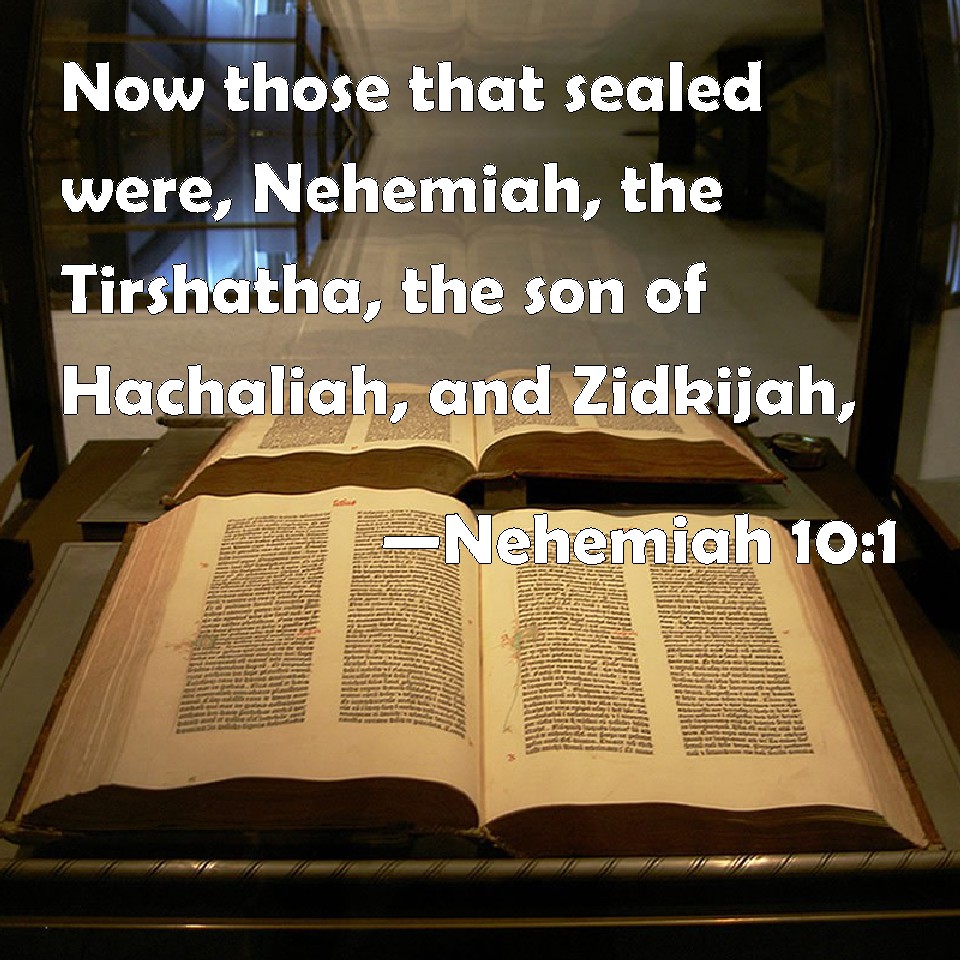 Choose a Background Nehemiah 10:1 Now those that sealed were, Nehemiah, the Tirshatha, the son of Hachaliah, and Zidkijah, KJV: Now those that sealed were, Nehemiah, the Tirshatha, the son of Hachaliah, and Zidkijah, DRB: And the subscribers were Nehemias, Athersatha the son of Hachelai, and Sedecias, DBT: And at the head of those that sealed were Nehemiah the Tirshatha, the son of Hachaliah, and Zedekiah. ERV: Now those that sealed were, Nehemiah the Tirshatha, the son of Hacaliah, and Zedekiah; WBT: Now those that sealed were, Nehemiah, the Tirshatha, the son of Hachaliah, and Zidkijah, WEB: Now those who sealed were: Nehemiah the governor, the son of Hacaliah, and Zedekiah, YLT: And over those sealed are Nehemiah the Tirshatha, son of Hachaliah, and Zidkijah,Links Nehemiah 10:1 NIV • Nehemiah 10:1 NLT • Nehemiah 10:1 ESV • Nehemiah 10:1 NASB • Nehemiah 10:1 KJV • Nehemiah 10:1 Interlinear • Nehemiah 10:1 Commentaries • Nehemiah 10:1 Parallel Texts • Nehemiah 10:1 Bible Apps • Nehemiah 10:1 Parallel • Bible Hub |