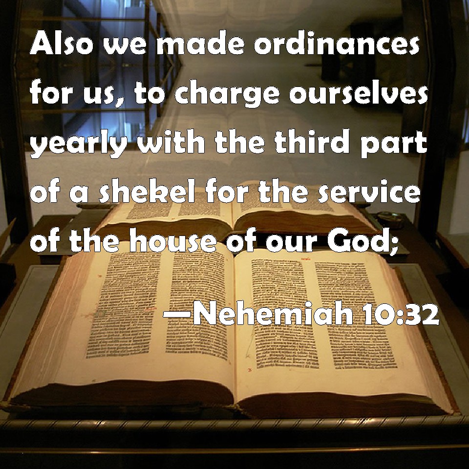 Choose a Background Nehemiah 10:32 Also we made ordinances for us, to charge ourselves yearly with the third part of a shekel for the service of the house of our God; KJV: Also we made ordinances for us, to charge ourselves yearly with the third part of a shekel for the service of the house of our God; DRB: And we made ordinances for ourselves, to give the third part of a side every year for the work of the house of our God, DBT: And we made ordinances for us, to charge ourselves yearly with the third part of a shekel for the service of the house of our God, ERV: Also we made ordinances for us, to charge ourselves yearly with the third part of a shekel for the service of the house of our God; WBT: Also we made ordinances for us, to charge ourselves yearly with the third part of a shekel for the service of the house of our God; WEB: Also we made ordinances for ourselves, to charge ourselves yearly with the third part of a shekel for the service of the house of our God; YLT: And we have appointed for ourselves commands, to put on ourselves the third of a shekel in a year, for the service of the house of our God,Links Nehemiah 10:32 NIV • Nehemiah 10:32 NLT • Nehemiah 10:32 ESV • Nehemiah 10:32 NASB • Nehemiah 10:32 KJV • Nehemiah 10:32 Interlinear • Nehemiah 10:32 Commentaries • Nehemiah 10:32 Parallel Texts • Nehemiah 10:32 Bible Apps • Nehemiah 10:32 Parallel • Bible Hub |