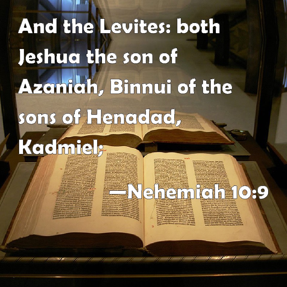 Choose a Background Nehemiah 10:9 And the Levites: both Jeshua the son of Azaniah, Binnui of the sons of Henadad, Kadmiel; KJV: And the Levites: both Jeshua the son of Azaniah, Binnui of the sons of Henadad, Kadmiel; DRB: And the Levites, Josue the son of Azanias, Bennui of the sons of Henadad. Cedmihel, DBT: And the Levites: Jeshua the son of Azaniah; Binnui, of the sons of Henadad; Kadmiel, ERV: And the Levites: namely, Jeshua the son of Azaniah, Binnui of the sons of Henadad, Kadmiel; WBT: And the Levites: both Jeshua the son of Azaniah, Binnui of the sons of Henadad, Kadmiel; WEB: The Levites: namely, Jeshua the son of Azaniah, Binnui of the sons of Henadad, Kadmiel; YLT: And the Levites: both Jeshua son of Azaniah, Binnui of the sons of Henadad, Kadmiel;Links Nehemiah 10:9 NIV • Nehemiah 10:9 NLT • Nehemiah 10:9 ESV • Nehemiah 10:9 NASB • Nehemiah 10:9 KJV • Nehemiah 10:9 Interlinear • Nehemiah 10:9 Commentaries • Nehemiah 10:9 Parallel Texts • Nehemiah 10:9 Bible Apps • Nehemiah 10:9 Parallel • Bible Hub |