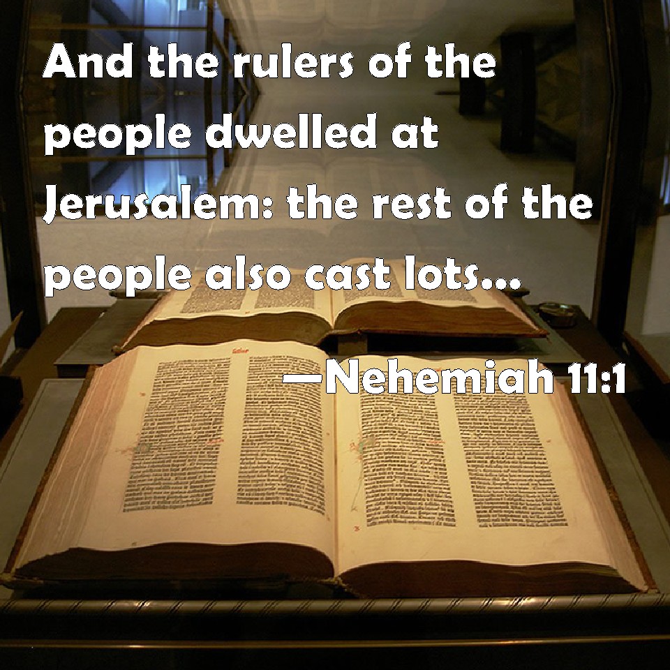 Choose a Background Nehemiah 11:1 And the rulers of the people dwelled at Jerusalem: the rest of the people also cast lots, to bring one of ten to dwell in Jerusalem the holy city, and nine parts to dwell in other cities. KJV: And the rulers of the people dwelt at Jerusalem: the rest of the people also cast lots, to bring one of ten to dwell in Jerusalem the holy city, and nine parts to dwell in other cities. DRB: And the princes of the people dwelt at Jerusalem: but the rest of the people cast lots, to take one part in ten to dwell in Jerusalem the holy city, and nine parts in the other cities. DBT: And the princes of the people dwelt in Jerusalem; and the rest of the people cast lots, to bring one of ten to dwell in Jerusalem, the holy city, and nine parts in the cities. ERV: And the princes of the people dwelt in Jerusalem: the rest of the people also cast lots, to bring one of ten to dwell in Jerusalem the holy city, and nine parts in the other cities. WBT: And the rulers of the people dwelt at Jerusalem: the rest of the people also cast lots, to bring one of ten to dwell in Jerusalem the holy city, and nine parts to dwell in other cities. WEB: The princes of the people lived in Jerusalem: the rest of the people also cast lots, to bring one of ten to dwell in Jerusalem the holy city, and nine parts in the [other] cities. YLT: And the heads of the people dwell in Jerusalem, and the rest of the people have caused to fall lots to bring in one out of ten to dwell in Jerusalem the holy city, and nine parts in the cities,Links Nehemiah 11:1 NIV • Nehemiah 11:1 NLT • Nehemiah 11:1 ESV • Nehemiah 11:1 NASB • Nehemiah 11:1 KJV • Nehemiah 11:1 Interlinear • Nehemiah 11:1 Commentaries • Nehemiah 11:1 Parallel Texts • Nehemiah 11:1 Bible Apps • Nehemiah 11:1 Parallel • Bible Hub |
