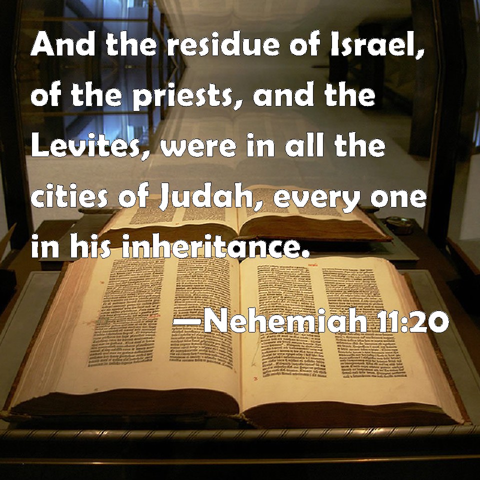 Choose a Background Nehemiah 11:20 And the residue of Israel, of the priests, and the Levites, were in all the cities of Judah, every one in his inheritance. KJV: And the residue of Israel, of the priests, and the Levites, were in all the cities of Judah, every one in his inheritance. DRB: And the rest of Israel, the priests and the Levites were in all the cities of Juda, every man in his possession. DBT: And the residue of Israel, the priests, and the Levites, were in all the cities of Judah, every one in his inheritance. ERV: And the residue of Israel, of the priests, the Levites, were in all the cities of Judah, every one in his inheritance. WBT: And the residue of Israel, of the priests, and the Levites, were in all the cities of Judah every one in his inheritance. WEB: The residue of Israel, of the priests, the Levites, were in all the cities of Judah, everyone in his inheritance. YLT: And the rest of Israel, of the priests, of the Levites, are in all cities of Judah, each in his inheritance;Links Nehemiah 11:20 NIV • Nehemiah 11:20 NLT • Nehemiah 11:20 ESV • Nehemiah 11:20 NASB • Nehemiah 11:20 KJV • Nehemiah 11:20 Interlinear • Nehemiah 11:20 Commentaries • Nehemiah 11:20 Parallel Texts • Nehemiah 11:20 Bible Apps • Nehemiah 11:20 Parallel • Bible Hub |