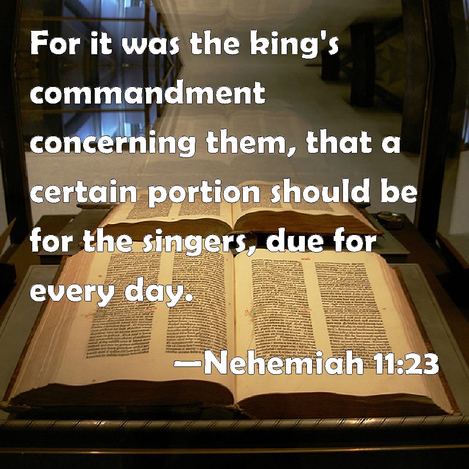Choose a Background Nehemiah 11:23 For it was the king's commandment concerning them, that a certain portion should be for the singers, due for every day. KJV: For it was the king's commandment concerning them, that a certain portion should be for the singers, due for every day. DRB: For the king's commandment was concerning them, and an order among the singing men day by day. DBT: For it was the king's commandment concerning them, and there was a settled portion for the singers, due for each day. ERV: For there was a commandment from the king concerning them, and a settled provision for the singers, as every day required. WBT: For it was the king's commandment concerning them, that a certain portion should be for the singers, due for every day. WEB: For there was a commandment from the king concerning them, and a settled provision for the singers, as every day required. YLT: for the command of the king is upon them, and support is for the singers, a matter of a day in its day.Links Nehemiah 11:23 NIV • Nehemiah 11:23 NLT • Nehemiah 11:23 ESV • Nehemiah 11:23 NASB • Nehemiah 11:23 KJV • Nehemiah 11:23 Interlinear • Nehemiah 11:23 Commentaries • Nehemiah 11:23 Parallel Texts • Nehemiah 11:23 Bible Apps • Nehemiah 11:23 Parallel • Bible Hub |
