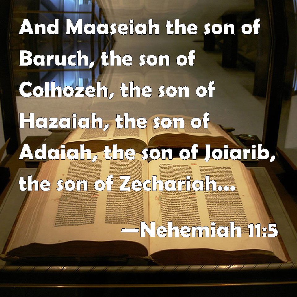 Choose a Background Nehemiah 11:5 And Maaseiah the son of Baruch, the son of Colhozeh, the son of Hazaiah, the son of Adaiah, the son of Joiarib, the son of Zechariah, the son of Shiloni. KJV: And Maaseiah the son of Baruch, the son of Colhozeh, the son of Hazaiah, the son of Adaiah, the son of Joiarib, the son of Zechariah, the son of Shiloni. DRB: Maasia the son of Baruch, the son of Cholhoza, the son of Hazia, the son of Adaia, the son of Joiarib, the son of Zacharias, the son of the Silonite: DBT: and Maaseiah the son of Baruch, the son of Col-hozeh, the son of Hazaiah, the son of Adaiah, the son of Joiarib, the son of Zechariah, the son of Shiloni. ERV: and Maaseiah the son of Baruch, the son of Col-hozeh, the son of Hazaiah, the son of Adaiah, the son of Joiarib, the son of Zechariah, the son of the Shilonite. WBT: And Maaseiah the son of Baruch, the son of Col-hozeh, the son of Hazaiah, the son of Adaiah, the son of Joiarib, the son of Zechariah, the son of Shiloni. WEB: and Maaseiah the son of Baruch, the son of Colhozeh, the son of Hazaiah, the son of Adaiah, the son of Joiarib, the son of Zechariah, the son of the Shilonite. YLT: and Masseiah son of Baruch, son of Col-Hozeh, son of Hazaiah, son of Adaiah, son of Joiarib, son of Zechariah, son of Shiloni;Links Nehemiah 11:5 NIV • Nehemiah 11:5 NLT • Nehemiah 11:5 ESV • Nehemiah 11:5 NASB • Nehemiah 11:5 KJV • Nehemiah 11:5 Interlinear • Nehemiah 11:5 Commentaries • Nehemiah 11:5 Parallel Texts • Nehemiah 11:5 Bible Apps • Nehemiah 11:5 Parallel • Bible Hub |