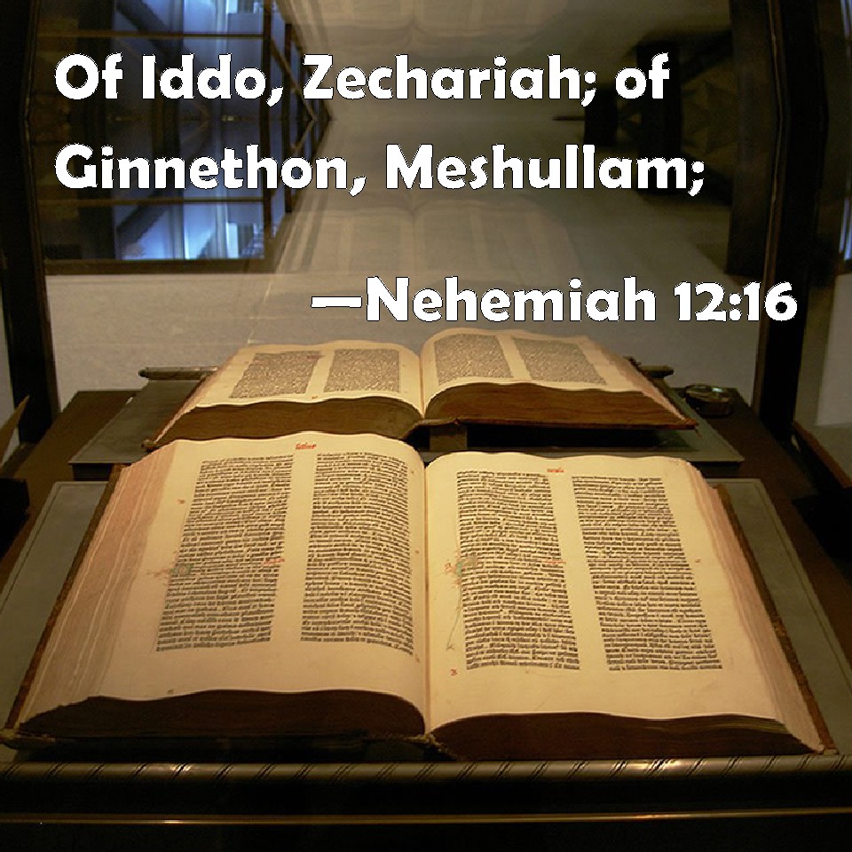Choose a Background Nehemiah 12:16 Of Iddo, Zechariah; of Ginnethon, Meshullam; KJV: Of Iddo, Zechariah; of Ginnethon, Meshullam; DRB: Of Adaia, Zacharia: of Genthon, Mosollam: DBT: of Iddo, Zechariah; of Ginnethon, Meshullam; ERV: of Iddo, Zechariah; of Gennethon, Meshullam; WBT: Of Iddo, Zechariah; of Ginnethon, Meshullam; WEB: of Iddo, Zechariah; of Ginnethon, Meshullam; YLT: of Iddo, Zechariah; of Ginnethon, Meshullam;Links Nehemiah 12:16 NIV • Nehemiah 12:16 NLT • Nehemiah 12:16 ESV • Nehemiah 12:16 NASB • Nehemiah 12:16 KJV • Nehemiah 12:16 Interlinear • Nehemiah 12:16 Commentaries • Nehemiah 12:16 Parallel Texts • Nehemiah 12:16 Bible Apps • Nehemiah 12:16 Parallel • Bible Hub |