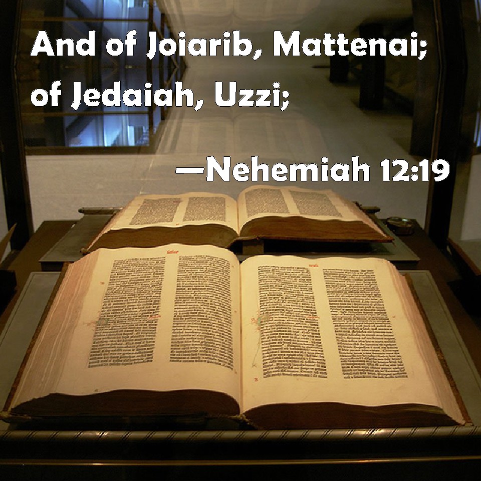 Choose a Background Nehemiah 12:19 And of Joiarib, Mattenai; of Jedaiah, Uzzi; KJV: And of Joiarib, Mattenai; of Jedaiah, Uzzi; DRB: Of Joiarib, Mathanai: of Jodaia, Azzi: DBT: and of Joiarib, Mattenai; of Jedaiah, Uzzi; ERV: and of Joiarib, Mattenai; of Jedaiah, Uzzi; WBT: And of Joiarib, Mattenai; of Jedaiah, Uzzi; WEB: and of Joiarib, Mattenai; of Jedaiah, Uzzi; YLT: and of Joiarib, Mattenai; of Jedaiah, Uzzi;Links Nehemiah 12:19 NIV • Nehemiah 12:19 NLT • Nehemiah 12:19 ESV • Nehemiah 12:19 NASB • Nehemiah 12:19 KJV • Nehemiah 12:19 Interlinear • Nehemiah 12:19 Commentaries • Nehemiah 12:19 Parallel Texts • Nehemiah 12:19 Bible Apps • Nehemiah 12:19 Parallel • Bible Hub |