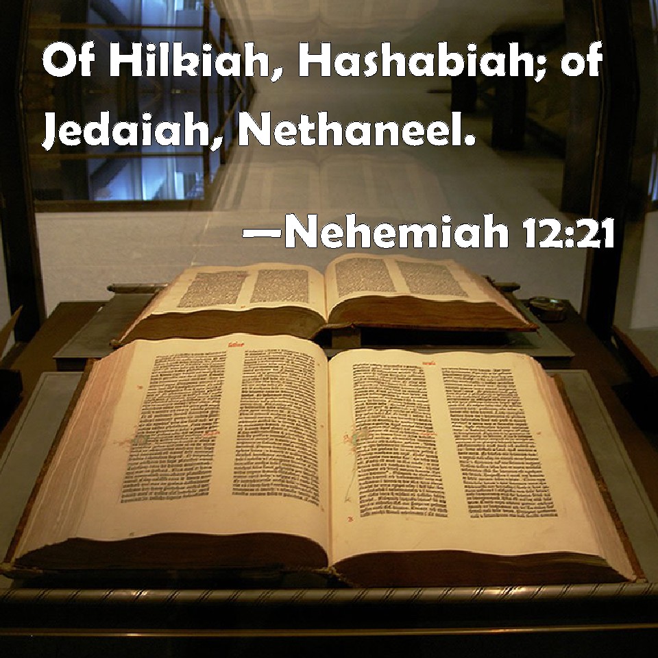 Choose a Background Nehemiah 12:21 Of Hilkiah, Hashabiah; of Jedaiah, Nethaneel. KJV: Of Hilkiah, Hashabiah; of Jedaiah, Nethaneel. DRB: Of Helcias, Hasebia: of Idaia, Nathanael. DBT: of Hilkijah, Hashabiah; of Jedaiah, Nethaneel. ERV: of Hilkiah, Hashabiah; of Jedaiah, Nethanel. WBT: Of Hilkiah, Hashabiah; of Jedaiah, Nethaneel. WEB: of Hilkiah, Hashabiah; of Jedaiah, Nethanel. YLT: of Hilkiah, Hashabiah; of Jedaiah, Nethaneel.Links Nehemiah 12:21 NIV • Nehemiah 12:21 NLT • Nehemiah 12:21 ESV • Nehemiah 12:21 NASB • Nehemiah 12:21 KJV • Nehemiah 12:21 Interlinear • Nehemiah 12:21 Commentaries • Nehemiah 12:21 Parallel Texts • Nehemiah 12:21 Bible Apps • Nehemiah 12:21 Parallel • Bible Hub |