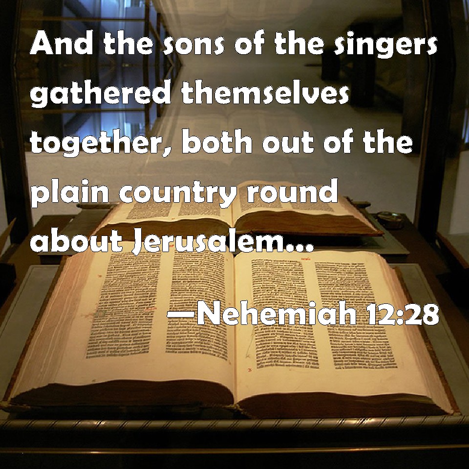 Choose a Background Nehemiah 12:28 And the sons of the singers gathered themselves together, both out of the plain country round about Jerusalem, and from the villages of Netophathi; KJV: And the sons of the singers gathered themselves together, both out of the plain country round about Jerusalem, and from the villages of Netophathi; DRB: And the sons of the singing men were gathered together out of the plain country about Jerusalem, and out of the villages of Nethuphati, DBT: And the children of the singers were assembled, both from the plain of Jordan round about Jerusalem, and from the villages of the Netophathites, ERV: And the sons of the singers gathered themselves together, both out of the plain round about Jerusalem, and from the villages of the Netophathites; WBT: And the sons of the singers assembled, both out of the plain country around Jerusalem, and from the villages of Netophathi; WEB: The sons of the singers gathered themselves together, both out of the plain around Jerusalem, and from the villages of the Netophathites; YLT: and sons of the singers are gathered together even from the circuit round about Jerusalem, and from the villages of Netophathi,Links Nehemiah 12:28 NIV • Nehemiah 12:28 NLT • Nehemiah 12:28 ESV • Nehemiah 12:28 NASB • Nehemiah 12:28 KJV • Nehemiah 12:28 Interlinear • Nehemiah 12:28 Commentaries • Nehemiah 12:28 Parallel Texts • Nehemiah 12:28 Bible Apps • Nehemiah 12:28 Parallel • Bible Hub |