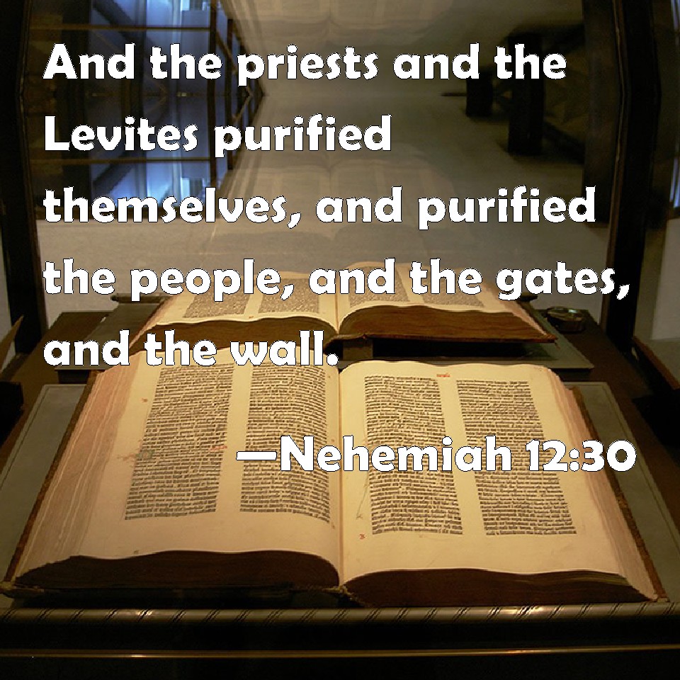 Choose a Background Nehemiah 12:30 And the priests and the Levites purified themselves, and purified the people, and the gates, and the wall. KJV: And the priests and the Levites purified themselves, and purified the people, and the gates, and the wall. DRB: And the priests and the Levites purified, and they purified the people, and the gates, and the wall. DBT: And the priests and the Levites purified themselves; and they purified the people, and the gates and the wall. ERV: And the priests and the Levites purified themselves; and they purified the people, and the gates, and the wall. WBT: And the priests and the Levites purified themselves, and purified the people, and the gates, and the wall. WEB: The priests and the Levites purified themselves; and they purified the people, and the gates, and the wall. YLT: and the priests and the Levites are cleansed, and they cleanse the people, and the gates, and the wall.Links Nehemiah 12:30 NIV • Nehemiah 12:30 NLT • Nehemiah 12:30 ESV • Nehemiah 12:30 NASB • Nehemiah 12:30 KJV • Nehemiah 12:30 Interlinear • Nehemiah 12:30 Commentaries • Nehemiah 12:30 Parallel Texts • Nehemiah 12:30 Bible Apps • Nehemiah 12:30 Parallel • Bible Hub |