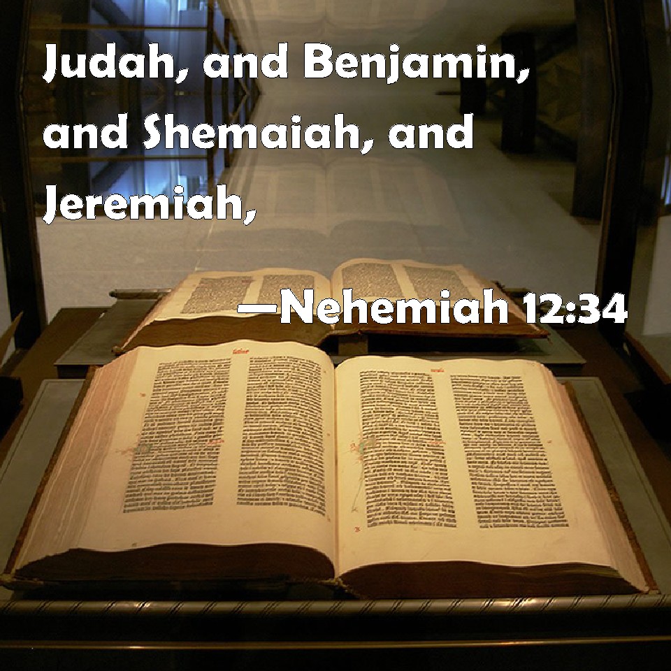 Choose a Background Nehemiah 12:34 Judah, and Benjamin, and Shemaiah, and Jeremiah, KJV: Judah, and Benjamin, and Shemaiah, and Jeremiah, DRB: Judas, and Benjamin, and Semeia, and Jeremias. DBT: Judah and Benjamin, and Shemaiah, and Jeremiah, ERV: Judah, and Benjamin, and Shemaiah, and Jeremiah, WBT: Judah, and Benjamin, and Shemaiah, and Jeremiah, WEB: Judah, and Benjamin, and Shemaiah, and Jeremiah, YLT: Judah, and Benjamin, and Shemaiah, and Jeremiah;Links Nehemiah 12:34 NIV • Nehemiah 12:34 NLT • Nehemiah 12:34 ESV • Nehemiah 12:34 NASB • Nehemiah 12:34 KJV • Nehemiah 12:34 Interlinear • Nehemiah 12:34 Commentaries • Nehemiah 12:34 Parallel Texts • Nehemiah 12:34 Bible Apps • Nehemiah 12:34 Parallel • Bible Hub |