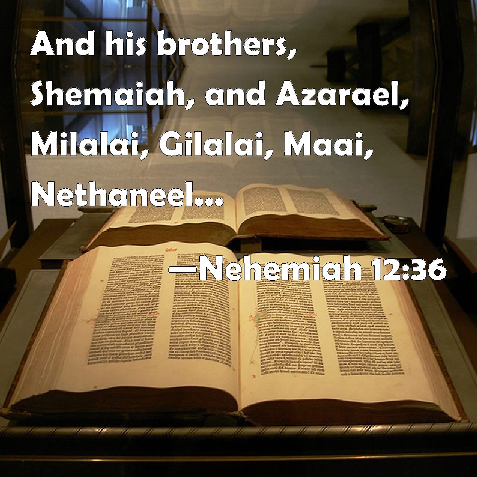 Choose a Background Nehemiah 12:36 And his brothers, Shemaiah, and Azarael, Milalai, Gilalai, Maai, Nethaneel, and Judah, Hanani, with the musical instruments of David the man of God, and Ezra the scribe before them. KJV: And his brethren, Shemaiah, and Azarael, Milalai, Gilalai, Maai, Nethaneel, and Judah, Hanani, with the musical instruments of David the man of God, and Ezra the scribe before them. DRB: And his brethren Semeia, and Azareel Malalai, Galalai, Maai, Nathanael, and Judas, and Hanani, with the musical instruments of David the man of God: and Esdras the scribe before them at the fountain gate. DBT: and his brethren, Shemaiah, and Azareel, Milalai, Gilalai, Maai, Nethaneel, and Judah, Hanani, with the musical instruments of David the man of God; and Ezra the scribe before them. ERV: and his brethren, Shemaiah, and Azarel, Milalai, Gilalai, Maai, Nethanel, and Judah, Hanani, with the musical instruments of David the man of God; and Ezra the scribe was before them: WBT: And his brethren, Shemaiah, and Azarael, Milalai, Gilalai, Maai, Nethaneel, and Judah, Hanani, with the musical instruments of David the man of God, and Ezra the scribe before them. WEB: and his brothers, Shemaiah, and Azarel, Milalai, Gilalai, Maai, Nethanel, and Judah, Hanani, with the musical instruments of David the man of God; and Ezra the scribe was before them. YLT: and his brethren Shemaiah, and Azarael, Milalai, Gilalai, Maai, Nethaneel, and Judah, Hanani, with instruments of song of David the man of God, and Ezra the scribe is before them;Links Nehemiah 12:36 NIV • Nehemiah 12:36 NLT • Nehemiah 12:36 ESV • Nehemiah 12:36 NASB • Nehemiah 12:36 KJV • Nehemiah 12:36 Interlinear • Nehemiah 12:36 Commentaries • Nehemiah 12:36 Parallel Texts • Nehemiah 12:36 Bible Apps • Nehemiah 12:36 Parallel • Bible Hub |