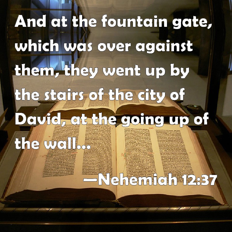 Choose a Background Nehemiah 12:37 And at the fountain gate, which was over against them, they went up by the stairs of the city of David, at the going up of the wall, above the house of David, even to the water gate eastward. KJV: And at the fountain gate, which was over against them, they went up by the stairs of the city of David, at the going up of the wall, above the house of David, even unto the water gate eastward. DRB: And they went up over against them by the stairs of the city of David, at the going up of the wall of the house of David, and to the water gate eastward: DBT: And at the fountain-gate, and over against them, they went up by the stairs of the city of David, at the ascent of the wall, above the house of David, even to the water-gate eastward. ERV: And by the fountain gate, and straight before them, they went up by the stairs of the city of David, at the going up of the wall, above the house of David, even unto the water gate eastward. WBT: And at the fountain-gate, which was over against them, they went up by the stairs of the city of David, at the ascent of the wall, above the house of David, even to the water-gate eastward. WEB: By the spring gate, and straight before them, they went up by the stairs of the city of David, at the ascent of the wall, above the house of David, even to the water gate eastward. YLT: and by the gate of the fountain and over-against them, they have gone up by the steps of the city of David, at the going up of the wall beyond the house of David, and unto the water-gate eastward.Links Nehemiah 12:37 NIV • Nehemiah 12:37 NLT • Nehemiah 12:37 ESV • Nehemiah 12:37 NASB • Nehemiah 12:37 KJV • Nehemiah 12:37 Interlinear • Nehemiah 12:37 Commentaries • Nehemiah 12:37 Parallel Texts • Nehemiah 12:37 Bible Apps • Nehemiah 12:37 Parallel • Bible Hub |