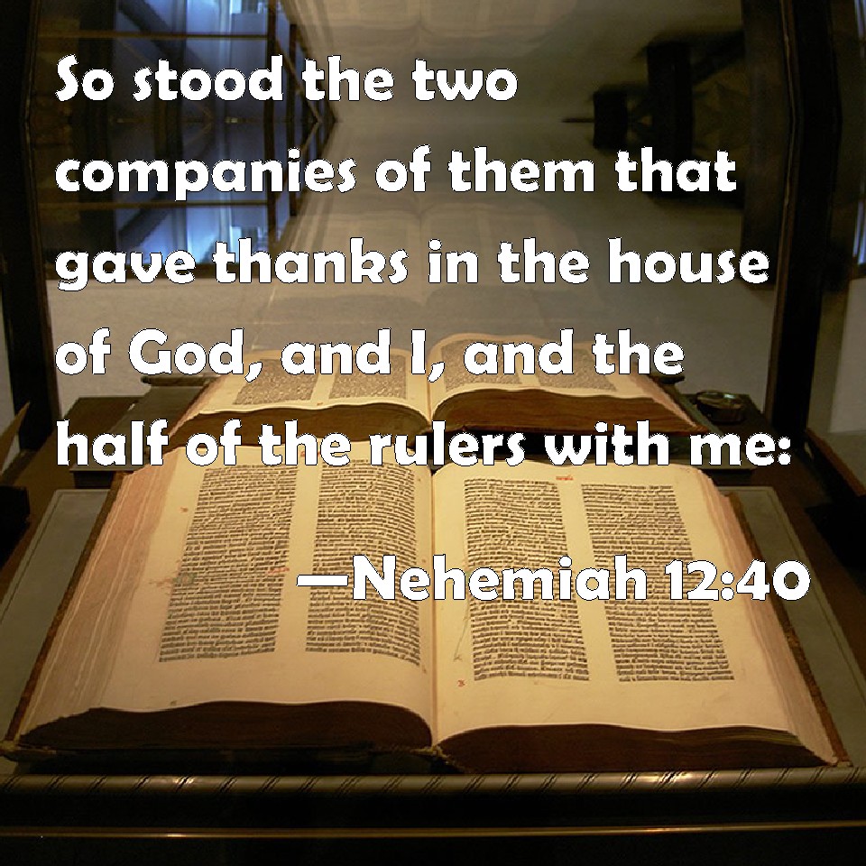 Choose a Background Nehemiah 12:40 So stood the two companies of them that gave thanks in the house of God, and I, and the half of the rulers with me: KJV: So stood the two companies of them that gave thanks in the house of God, and I, and the half of the rulers with me: DRB: And the two choirs of them that gave praise stood still at the house of God, and I and the half of the magistrates with me. DBT: And both choirs stood in the house of God, and I, and the half of the rulers with me; ERV: So stood the two companies of them that gave thanks in the house of God, and I, and the half of the rulers with me: WBT: So stood the two companies of them that gave thanks in the house of God, and I, and the half of the rulers with me: WEB: So stood the two companies of those who gave thanks in the house of God, and I, and the half of the rulers with me; YLT: And the two thanksgiving companies stand in the house of God, and I and half of the prefects with me,Links Nehemiah 12:40 NIV • Nehemiah 12:40 NLT • Nehemiah 12:40 ESV • Nehemiah 12:40 NASB • Nehemiah 12:40 KJV • Nehemiah 12:40 Interlinear • Nehemiah 12:40 Commentaries • Nehemiah 12:40 Parallel Texts • Nehemiah 12:40 Bible Apps • Nehemiah 12:40 Parallel • Bible Hub |