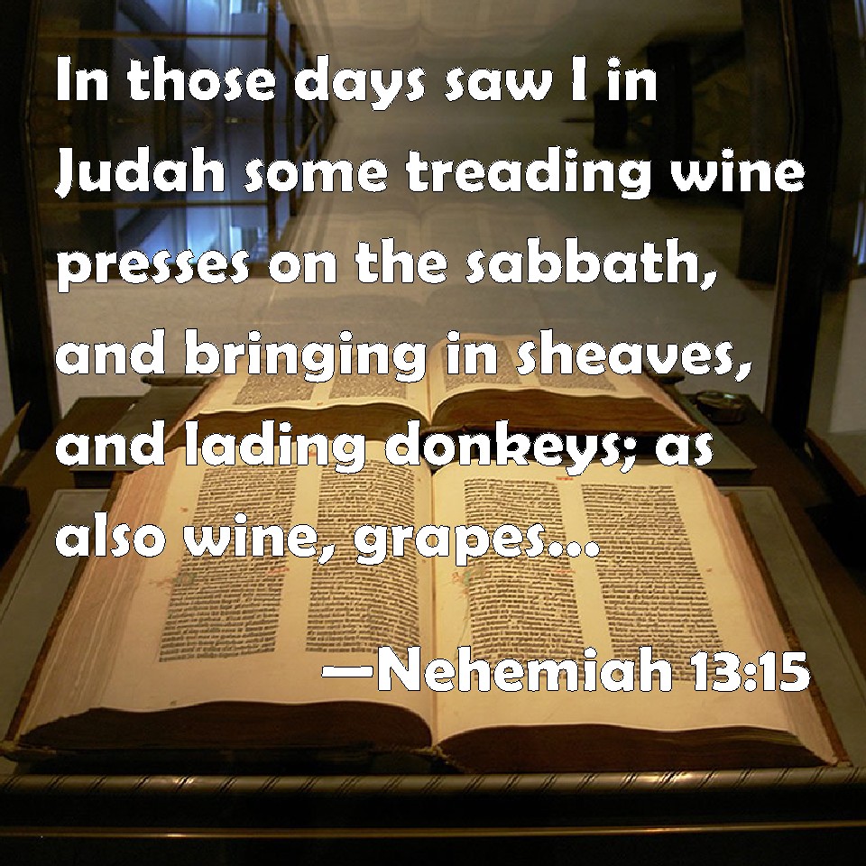 KJV:  In those days saw I in Judah some treading wine presses on the sabbath, and bringing in sheaves, and lading asses; as also wine, grapes, and figs, and all manner of burdens, which they brought into Jerusalem on the sabbath day: and I testified against them in the day wherein they sold victuals.