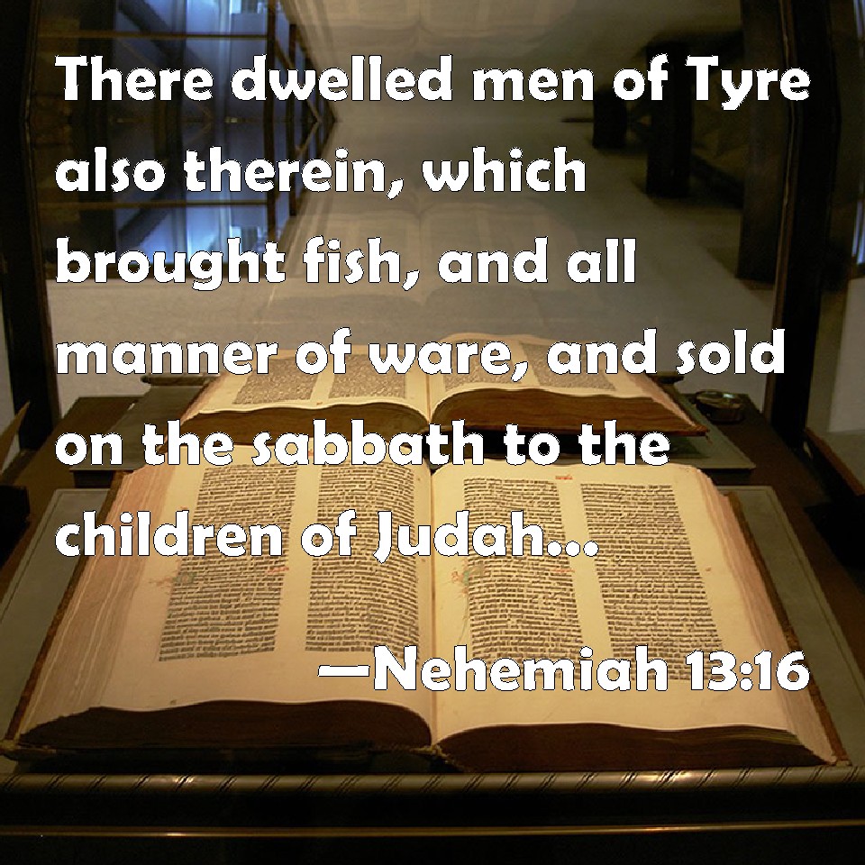 Choose a Background Nehemiah 13:16 There dwelled men of Tyre also therein, which brought fish, and all manner of ware, and sold on the sabbath to the children of Judah, and in Jerusalem. KJV: There dwelt men of Tyre also therein, which brought fish, and all manner of ware, and sold on the sabbath unto the children of Judah, and in Jerusalem. DRB: Some Tyrians also dwelt there, who brought fish, and all manner of wares: and they sold them on the sabbaths to the children of Juda in Jerusalem. DBT: Men of Tyre also dwelt therein, who brought fish and all manner of ware, and sold it on the sabbath to the children of Judah, and in Jerusalem. ERV: There dwelt men of Tyre also therein, which brought in fish, and all manner of ware, and sold on the sabbath unto the children of Judah, and in Jerusalem. WBT: There dwelt men of Tyre also therein, who brought fish, and all manner of wares, and sold on the sabbath to the children of Judah, and in Jerusalem. WEB: There lived men of Tyre also therein, who brought in fish, and all kinds of wares, and sold on the Sabbath to the children of Judah, and in Jerusalem. YLT: And the Tyrians have dwelt in it, bringing in fish, and every ware, and selling on sabbath to the sons of Judah and in Jerusalem.Links Nehemiah 13:16 NIV • Nehemiah 13:16 NLT • Nehemiah 13:16 ESV • Nehemiah 13:16 NASB • Nehemiah 13:16 KJV • Nehemiah 13:16 Interlinear • Nehemiah 13:16 Commentaries • Nehemiah 13:16 Parallel Texts • Nehemiah 13:16 Bible Apps • Nehemiah 13:16 Parallel • Bible Hub |