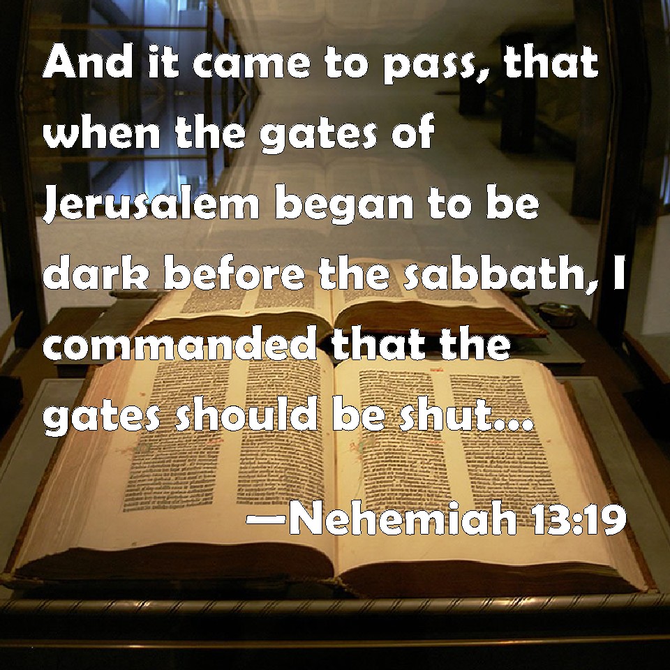 DBT:  And it came to pass, that when it began to be dark in the gates of Jerusalem before the sabbath, I commanded that the gates should be shut; and I commanded that they should not be opened till after the sabbath. And I set some of my servants at the gates, so that no burden should be brought in on the sabbath day.