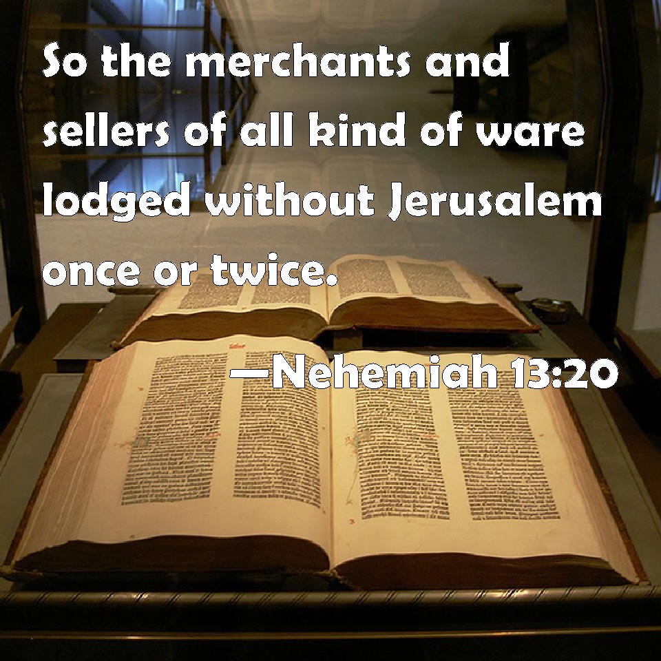 Nehemiah 13:20 So the merchants and sellers of all kind of ware lodged without Jerusalem once or twice.