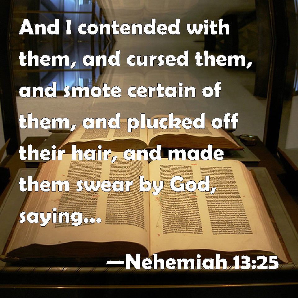 Choose a Background Nehemiah 13:25 And I contended with them, and cursed them, and smote certain of them, and plucked off their hair, and made them swear by God, saying, You shall not give your daughters to their sons, nor take their daughters to your sons, or for yourselves. KJV: And I contended with them, and cursed them, and smote certain of them, and plucked off their hair, and made them swear by God, saying, Ye shall not give your daughters unto their sons, nor take their daughters unto your sons, or for yourselves. DRB: And I chid them, and laid my curse upon them. And I beat some of them, and shaved off their hair, and made them swear by God that they would not give their daughters to their sons, nor take their daughters for their sons, nor for themselves, saying: DBT: And I contended with them, and cursed them, and smote certain of them and plucked off their hair, and adjured them by God saying, Ye shall not give your daughters to their sons, nor take their daughters for your sons or for yourselves. ERV: And I contended with them, and cursed them, and smote certain of them, and plucked off their hair, and made them swear by God, saying, Ye shall not give your daughters unto their sons, nor take their daughters for your sons, or for yourselves. WBT: And I contended with them, and cursed them, and smote certain of them, and plucked off their hair, and made them swear by God, saying, Ye shall not give your daughters to their sons, nor take their daughters to your sons, or for yourselves. WEB: I contended with them, and cursed them, and struck certain of them, and plucked off their hair, and made them swear by God, [saying], "You shall not give your daughters to their sons, nor take their daughters for your sons, or for yourselves. YLT: And I strive with them, and declare them vile, and smite certain of them, and pluck off their hair, and cause them to swear by God, 'Ye do not give your daughters to their sons, nor do ye take of their daughters to your sons, and to yourselves.Links Nehemiah 13:25 NIV • Nehemiah 13:25 NLT • Nehemiah 13:25 ESV • Nehemiah 13:25 NASB • Nehemiah 13:25 KJV • Nehemiah 13:25 Interlinear • Nehemiah 13:25 Commentaries • Nehemiah 13:25 Parallel Texts • Nehemiah 13:25 Bible Apps • Nehemiah 13:25 Parallel • Bible Hub |