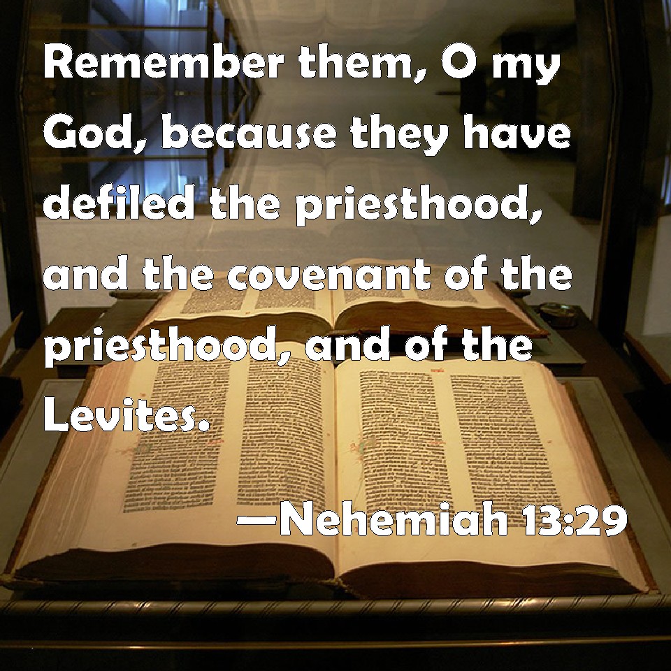 Choose a Background Nehemiah 13:29 Remember them, O my God, because they have defiled the priesthood, and the covenant of the priesthood, and of the Levites. KJV: Remember them, O my God, because they have defiled the priesthood, and the covenant of the priesthood, and of the Levites. DRB: Remember them, O Lord my God, that defile the priesthood, and the law of priests and Levites. DBT: Remember them, my God, for they are polluters of the priesthood, and of the covenant of the priesthood and of the Levites! ERV: Remember them, O my God, because they have defiled the priesthood, and the covenant of the priesthood, and of the Levites. WBT: Remember them, O my God, because they have defiled the priesthood, and the covenant of the priesthood and of the Levites. WEB: Remember them, my God, because they have defiled the priesthood, and the covenant of the priesthood, and of the Levites. YLT: Be mindful of them, O my God, for the redeemed of the priesthood, and the covenant of the priesthood, and of the Levites.Links Nehemiah 13:29 NIV • Nehemiah 13:29 NLT • Nehemiah 13:29 ESV • Nehemiah 13:29 NASB • Nehemiah 13:29 KJV • Nehemiah 13:29 Interlinear • Nehemiah 13:29 Commentaries • Nehemiah 13:29 Parallel Texts • Nehemiah 13:29 Bible Apps • Nehemiah 13:29 Parallel • Bible Hub |