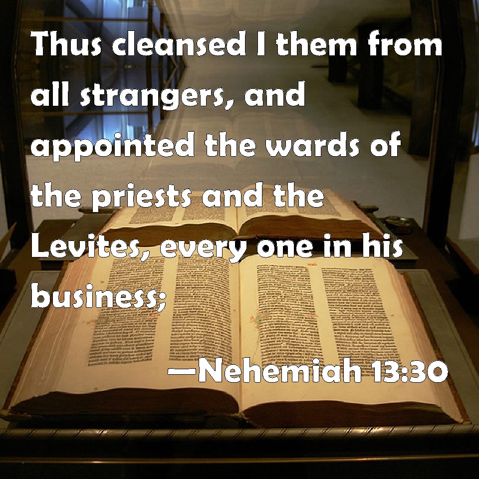 Choose a Background Nehemiah 13:30 Thus cleansed I them from all strangers, and appointed the wards of the priests and the Levites, every one in his business; KJV: Thus cleansed I them from all strangers, and appointed the wards of the priests and the Levites, every one in his business; DRB: So I separated from them all strangers, and I appointed the courses of the priests and the Levites, every man in his ministry : DBT: And I purified them from all foreigners, and appointed the charges of the priests and the Levites, every one in his service; ERV: Thus cleansed I them from all strangers, and appointed wards for the priests and for the Levites, every one in his work; WBT: Thus I cleansed them from all strangers, and appointed the wards of the priests and the Levites, every one in his business; WEB: Thus I cleansed them from all foreigners, and appointed duties for the priests and for the Levites, everyone in his work; YLT: And I have cleansed them from every stranger, and appoint charges to priests and to Levites, each in his work,Links Nehemiah 13:30 NIV • Nehemiah 13:30 NLT • Nehemiah 13:30 ESV • Nehemiah 13:30 NASB • Nehemiah 13:30 KJV • Nehemiah 13:30 Interlinear • Nehemiah 13:30 Commentaries • Nehemiah 13:30 Parallel Texts • Nehemiah 13:30 Bible Apps • Nehemiah 13:30 Parallel • Bible Hub |