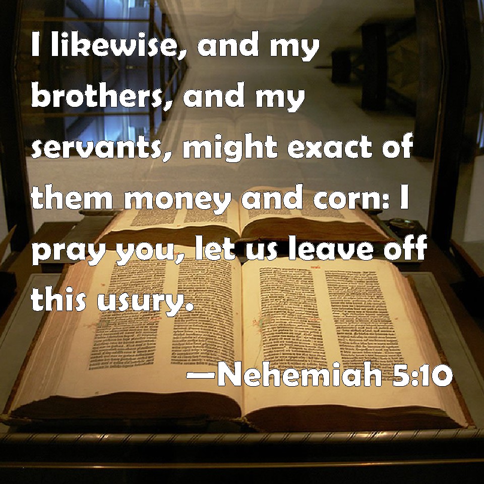 Choose a Background Nehemiah 5:10 I likewise, and my brothers, and my servants, might exact of them money and corn: I pray you, let us leave off this usury. KJV: I likewise, and my brethren, and my servants, might exact of them money and corn: I pray you, let us leave off this usury. DRB: Both I and my brethren, and my servants, have lent money and corn to many: let us all agree not to call for it again; let us forgive the debt that is owing to us. DBT: I also, my brethren and my servants, we might exact usury of them, money and corn. I pray you, let us leave off this usury. ERV: And I likewise, my brethren and my servants, do lend them money and corn on usury. I pray you, let us leave off this usury. WBT: I likewise, my brethren, and my servants, might exact of them money and corn: I pray you, let us leave off this usury. WEB: I likewise, my brothers and my servants, lend them money and grain. Please let us stop this usury. YLT: And also, I, my brethren, and my servants, are exacting of them silver and corn; let us leave off, I pray you, this usury.Links Nehemiah 5:10 NIV • Nehemiah 5:10 NLT • Nehemiah 5:10 ESV • Nehemiah 5:10 NASB • Nehemiah 5:10 KJV • Nehemiah 5:10 Interlinear • Nehemiah 5:10 Commentaries • Nehemiah 5:10 Parallel Texts • Nehemiah 5:10 Bible Apps • Nehemiah 5:10 Parallel • Bible Hub |