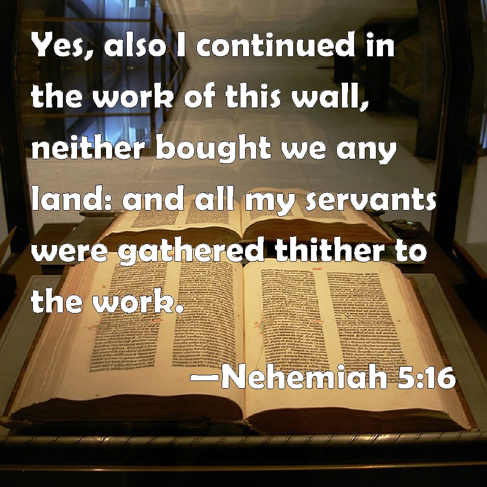 Choose a Background Nehemiah 5:16 Yes, also I continued in the work of this wall, neither bought we any land: and all my servants were gathered thither to the work. KJV: Yea, also I continued in the work of this wall, neither bought we any land: and all my servants were gathered thither unto the work. DRB: Moreover I built in the work of the wall, and I bought no land, and all my servants were gathered together to the work. DBT: Yea, also I applied myself to this work of the wall, and we bought no fields; and all my servants were gathered thither for the work. ERV: Yea, also I continued in the work of this wall, neither bought we any land: and all my servants were gathered thither unto the work. WBT: Yea, also I continued in the work of this wall, neither bought we any land: and all my servants were gathered thither to the work. WEB: Yes, also I continued in the work of this wall, neither bought we any land: and all my servants were gathered there to the work. YLT: And also, in the work of this wall I have done mightily, even a field we have not bought, and all my servants are gathered there for the work;Links Nehemiah 5:16 NIV • Nehemiah 5:16 NLT • Nehemiah 5:16 ESV • Nehemiah 5:16 NASB • Nehemiah 5:16 KJV • Nehemiah 5:16 Interlinear • Nehemiah 5:16 Commentaries • Nehemiah 5:16 Parallel Texts • Nehemiah 5:16 Bible Apps • Nehemiah 5:16 Parallel • Bible Hub |