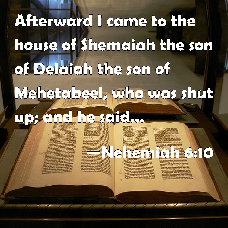 Choose a Background Nehemiah 6:10 Afterward I came to the house of Shemaiah the son of Delaiah the son of Mehetabeel, who was shut up; and he said, Let us meet together in the house of God, within the temple, and let us shut the doors of the temple: for they will come to slay you; yes, in the night will they come to slay you. KJV: Afterward I came unto the house of Shemaiah the son of Delaiah the son of Mehetabeel, who was shut up; and he said, Let us meet together in the house of God, within the temple, and let us shut the doors of the temple: for they will come to slay thee; yea, in the night will they come to slay thee. DRB: And I went into the house of Samaia the son of Delaia, the son of Metabeel privately. And he said: Let us consult together in the house of God in the midst of the temple: and let us shut the doors of the temple, for they will come to kill thee, and in the night they will come to slay thee. DBT: And I came to the house of Shemaiah the son of Delaiah, the son of Mehetabeel, who had shut himself up. And he said, Let us meet together in the house of God, within the temple, and let us shut the doors of the temple; for they are coming to kill thee; even in the night are they coming to kill thee. ERV: And I went unto the house of Shemaiah the son of Delaiah the son of Mehetabel, who was shut up; and he said, Let us meet together in the house of God, within the temple, and let us shut the doors of the temple: for they will come to slay thee; yea, in the night will they come to slay thee. WBT: Afterward I came to the house of Shemaiah the son of Delaiah the son of Mehetabeel, who was shut up; and he said, Let us meet together in the house of God, within the temple, and let us shut the doors of the temple: for they will come to slay thee; yea, in the night will they come to slay thee. WEB: I went to the house of Shemaiah the son of Delaiah the son of Mehetabel, who was shut in at his home; and he said, "Let us meet together in the house of God, within the temple, and let us shut the doors of the temple; for they will come to kill you; yes, in the night will they come to kill you." YLT: And I have entered the house of Shemaiah son of Delaiah, son of Mehetabeel — and he is restrained — and he saith, 'Let us meet at the house of God, at the inside of the temple, and we shut the doors of the temple, for they are coming in to slay thee — yea, by night they are coming in to slay thee.'Links Nehemiah 6:10 NIV • Nehemiah 6:10 NLT • Nehemiah 6:10 ESV • Nehemiah 6:10 NASB • Nehemiah 6:10 KJV • Nehemiah 6:10 Interlinear • Nehemiah 6:10 Commentaries • Nehemiah 6:10 Parallel Texts • Nehemiah 6:10 Bible Apps • Nehemiah 6:10 Parallel • Bible Hub |