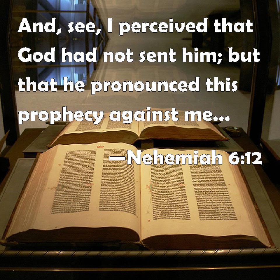 Choose a Background Nehemiah 6:12 And, see, I perceived that God had not sent him; but that he pronounced this prophecy against me: for Tobiah and Sanballat had hired him. KJV: And, lo, I perceived that God had not sent him; but that he pronounced this prophecy against me: for Tobiah and Sanballat had hired him. DRB: And I understood that God had not sent him, but that he had spoken to me as if he had been prophesying, and Tobias, and Sanaballat had hired him. DBT: And I perceived, and behold, God had not sent him; for he pronounced this prophecy against me; and Tobijah and Sanballat had hired him. ERV: And I discerned, and, lo, God had not sent him: but he pronounced this prophecy against me: and Tobiah and Sanballat had hired him. WBT: And lo, I perceived that God had not sent him; but that he pronounced this prophecy against me: for Tobiah and Sanballat had hired him. WEB: I discerned, and behold, God had not sent him; but he pronounced this prophecy against me. Tobiah and Sanballat had hired him. YLT: And I discern, and lo, God hath not sent him, for in the prophecy he hath spoken unto me both Tobiah and Sanballat hired him,Links Nehemiah 6:12 NIV • Nehemiah 6:12 NLT • Nehemiah 6:12 ESV • Nehemiah 6:12 NASB • Nehemiah 6:12 KJV • Nehemiah 6:12 Interlinear • Nehemiah 6:12 Commentaries • Nehemiah 6:12 Parallel Texts • Nehemiah 6:12 Bible Apps • Nehemiah 6:12 Parallel • Bible Hub |