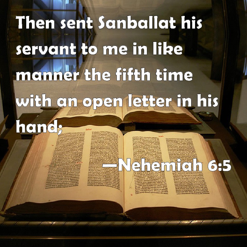 Nehemiah 6:5 Then sent Sanballat his servant to me in like manner the fifth time with an open letter in his hand;