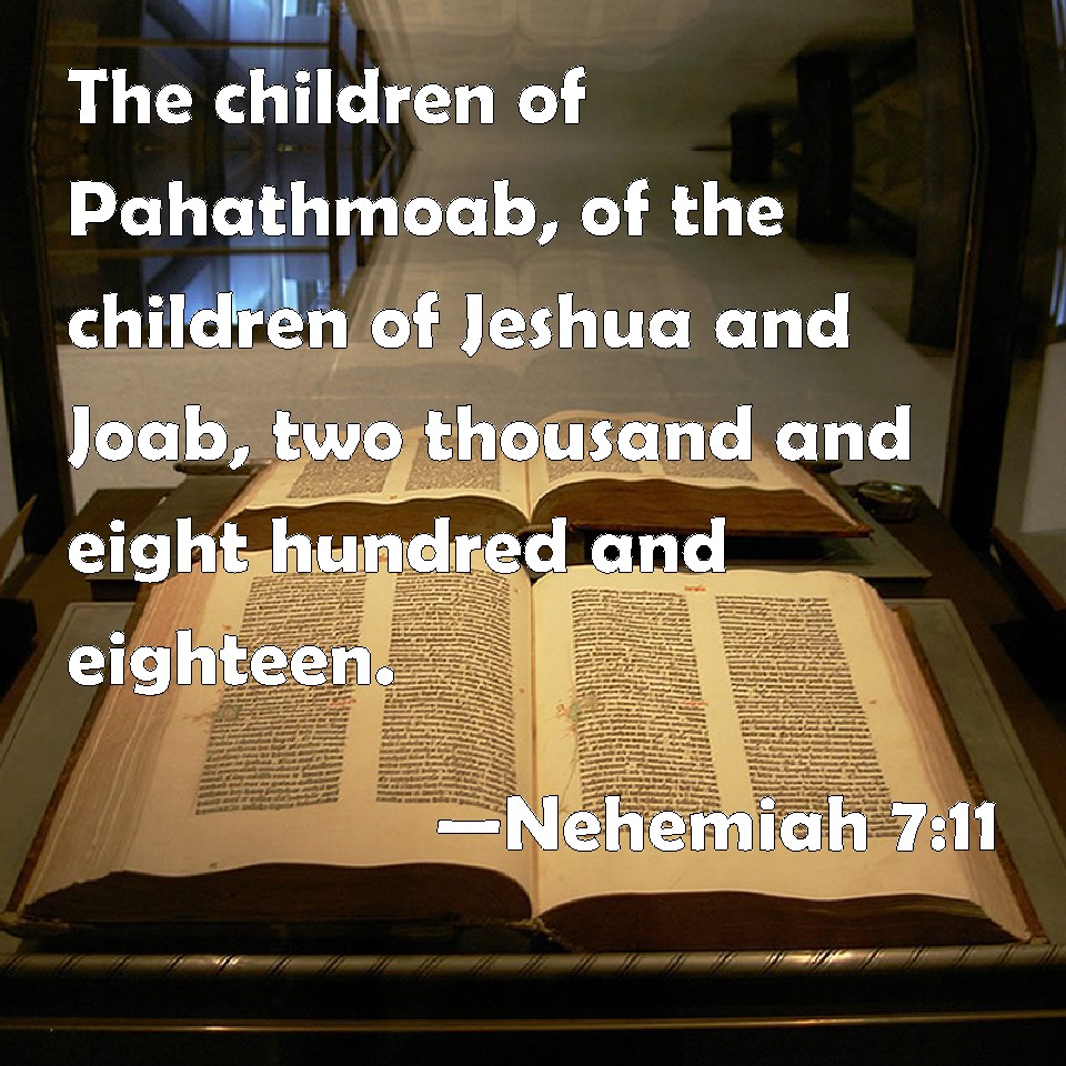 Choose a Background Nehemiah 7:11 The children of Pahathmoab, of the children of Jeshua and Joab, two thousand and eight hundred and eighteen. KJV: The children of Pahathmoab, of the children of Jeshua and Joab, two thousand and eight hundred and eighteen. DRB: The children of Phahath Moab of the children of Josue and Joab, two thousand eight hundred eighteen. DBT: The children of Pahath-Moab, of the children of Jeshua and Joab, two thousand eight hundred and eighteen. ERV: The children of Pahath-moab, of the children of Jeshua and Joab, two thousand and eight hundred and eighteen. WBT: The children of Pahath-moab, of the children of Jeshua and Joab, two thousand and eight hundred and eighteen. WEB: The children of Pahathmoab, of the children of Jeshua and Joab, two thousand eight hundred [and] eighteen. YLT: Sons of Pahath-Moab, of the sons of Jeshua and Joab: two thousand and eight hundred and eighteen.Links Nehemiah 7:11 NIV • Nehemiah 7:11 NLT • Nehemiah 7:11 ESV • Nehemiah 7:11 NASB • Nehemiah 7:11 KJV • Nehemiah 7:11 Interlinear • Nehemiah 7:11 Commentaries • Nehemiah 7:11 Parallel Texts • Nehemiah 7:11 Bible Apps • Nehemiah 7:11 Parallel • Bible Hub |