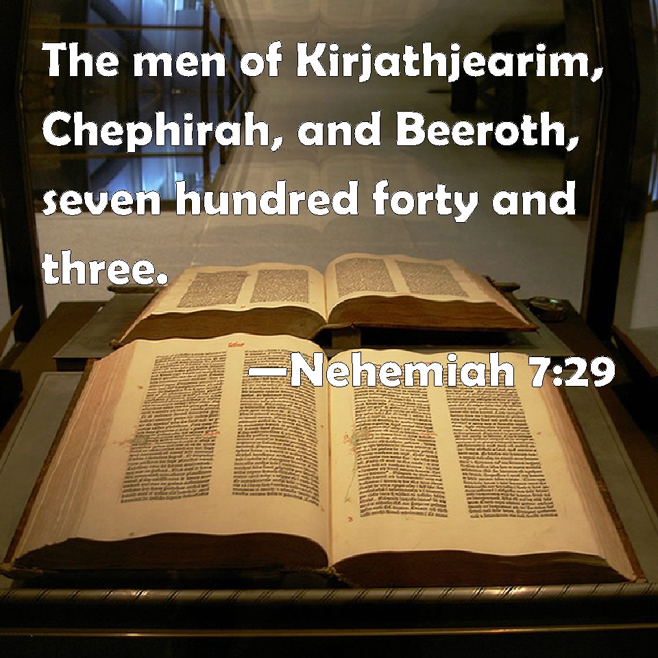 Choose a Background Nehemiah 7:29 The men of Kirjathjearim, Chephirah, and Beeroth, seven hundred forty and three. KJV: The men of Kirjathjearim, Chephirah, and Beeroth, seven hundred forty and three. DRB: The men of Cariathiarim, Cephira, end Beroth, seven hundred forty-three. DBT: The men of Kirjath-jearim, Chephirah, and Beeroth, seven hundred and forty-three. ERV: The men of Kirjath-jearim, Chephirah, and Beeroth, seven hundred forty and three. WBT: The men of Kirjath-jearim, Chephirah, and Beeroth, seven hundred and forty three. WEB: The men of Kiriath Jearim, Chephirah, and Beeroth, seven hundred forty-three. YLT: Men of Kirjath-Jearim, Chephirah, and Beeroth: seven hundred forty and three.Links Nehemiah 7:29 NIV • Nehemiah 7:29 NLT • Nehemiah 7:29 ESV • Nehemiah 7:29 NASB • Nehemiah 7:29 KJV • Nehemiah 7:29 Interlinear • Nehemiah 7:29 Commentaries • Nehemiah 7:29 Parallel Texts • Nehemiah 7:29 Bible Apps • Nehemiah 7:29 Parallel • Bible Hub |