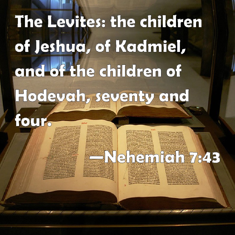 Choose a Background Nehemiah 7:43 The Levites: the children of Jeshua, of Kadmiel, and of the children of Hodevah, seventy and four. KJV: The Levites: the children of Jeshua, of Kadmiel, and of the children of Hodevah, seventy and four. DRB: The children of Josue and Cedmihel, the sons DBT: The Levites: the children of Jeshua and of Kadmiel, of the children of Hodvah, seventy-four. ERV: The Levites: the children of Jeshua, of Kadmiel, of the children of Hodevah, seventy and four. WBT: The Levites: the children of Jeshua, of Kadmiel, and of the children of Hodevah, seventy four. WEB: The Levites: the children of Jeshua, of Kadmiel, of the children of Hodevah, seventy-four. YLT: The Levites: sons of Jeshua, of Kadmiel: of sons of Hodevah: seventy and four.Links Nehemiah 7:43 NIV • Nehemiah 7:43 NLT • Nehemiah 7:43 ESV • Nehemiah 7:43 NASB • Nehemiah 7:43 KJV • Nehemiah 7:43 Interlinear • Nehemiah 7:43 Commentaries • Nehemiah 7:43 Parallel Texts • Nehemiah 7:43 Bible Apps • Nehemiah 7:43 Parallel • Bible Hub |