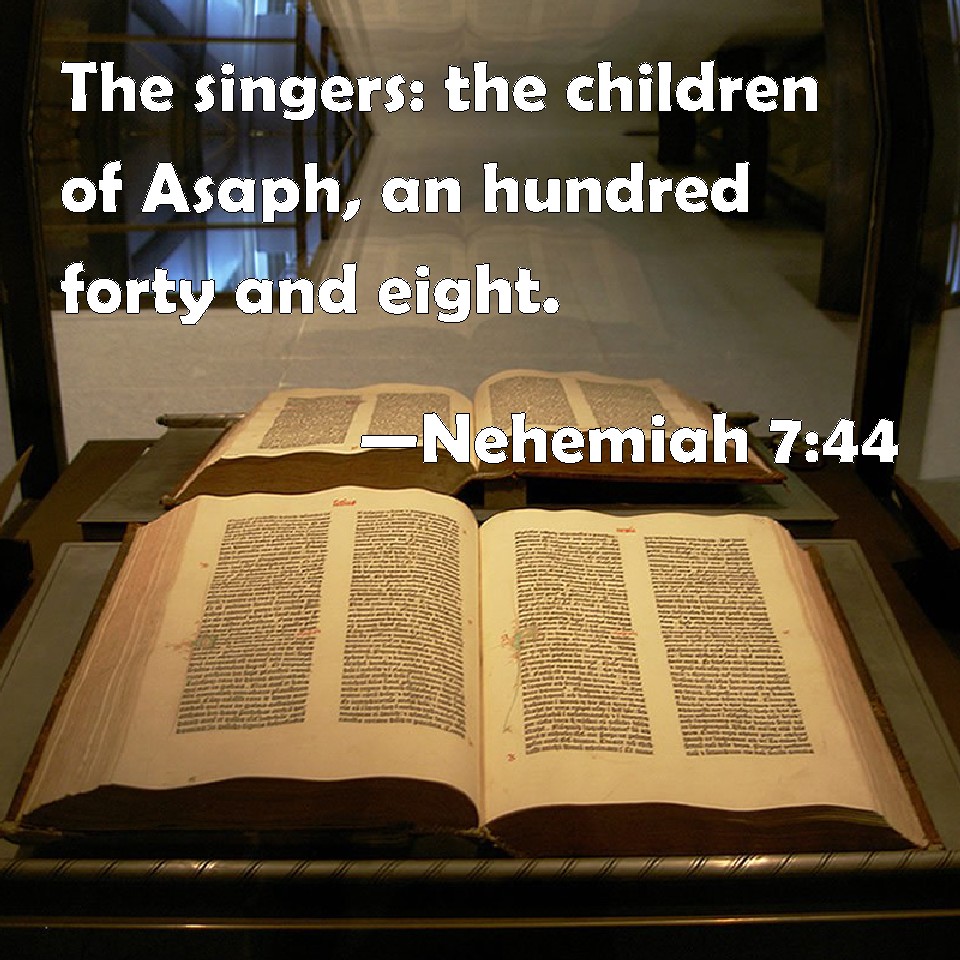 Nehemiah 7:44 The singers: the children of Asaph, an hundred forty and eight.