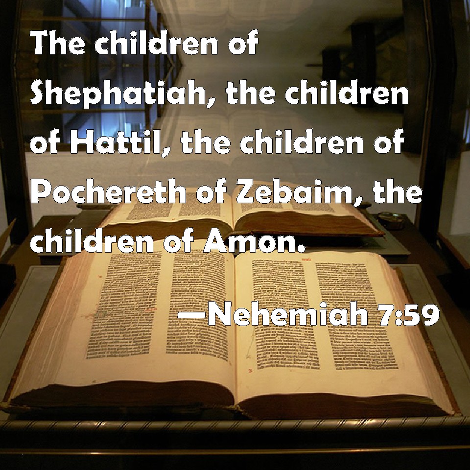 Choose a Background Nehemiah 7:59 The children of Shephatiah, the children of Hattil, the children of Pochereth of Zebaim, the children of Amon. KJV: The children of Shephatiah, the children of Hattil, the children of Pochereth of Zebaim, the children of Amon. DRB: The children of Saphatia, the children of Hatil, the children of Phochereth, who was born of Sabaim, the son of Amon. DBT: the children of Shephatiah, the children of Hattil, the children of Pochereth-Hazzebaim, the children of Amon. ERV: the children of Shephatiah, the children of Hattil, the children of Pochereth-hazzebaim, the children of Amon. WBT: The children of Shephatiah, the children of Hattil, the children of Pochereth of Zebaim, the children of Amon. WEB: the children of Shephatiah, the children of Hattil, the children of Pochereth Hazzebaim, the children of Amon. YLT: sons of Shephatiah, sons of Hattil, sons of Pochereth of Zebaim, sons of Amon.Links Nehemiah 7:59 NIV • Nehemiah 7:59 NLT • Nehemiah 7:59 ESV • Nehemiah 7:59 NASB • Nehemiah 7:59 KJV • Nehemiah 7:59 Interlinear • Nehemiah 7:59 Commentaries • Nehemiah 7:59 Parallel Texts • Nehemiah 7:59 Bible Apps • Nehemiah 7:59 Parallel • Bible Hub |