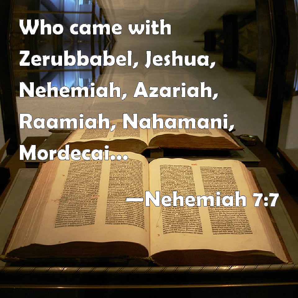 Choose a Background Nehemiah 7:7 Who came with Zerubbabel, Jeshua, Nehemiah, Azariah, Raamiah, Nahamani, Mordecai, Bilshan, Mispereth, Bigvai, Nehum, Baanah. The number, I say, of the men of the people of Israel was this; KJV: Who came with Zerubbabel, Jeshua, Nehemiah, Azariah, Raamiah, Nahamani, Mordecai, Bilshan, Mispereth, Bigvai, Nehum, Baanah. The number, I say, of the men of the people of Israel was this; DRB: Who came with Zorobabel, Josue, Nehemias, Azarias, Raamias, Nahamani, Mardochai, Belsam, Mespharath, Begoia, Nahum, Baana. The number of the men of the people of Israel: DBT: those who came with Zerubbabel, Jeshua, Nehemiah, Azariah, Raamiah, Nahamani, Mordecai, Bilshan, Mispereth, Bigvai, Nehum, Baanah. The number of the men of the people of Israel: ERV: who came with Zerubbabel, Jeshua, Nehemiah, Azariah, Raamiah, Nahamani, Mordecai, Bilshan, Mispereth, Bigvai, Nehum, Baanah. The number of the men of the people of Israel: WBT: Who came with Zerubbabel, Jeshua, Nehemiah, Azariah, Raamiah, Nahamani, Mordecai, Bilshan, Mispereth, Bigvai, Nehum, Baanah. The number, I say, of the men of the people of Israel was this; WEB: who came with Zerubbabel, Jeshua, Nehemiah, Azariah, Raamiah, Nahamani, Mordecai, Bilshan, Mispereth, Bigvai, Nehum, Baanah. The number of the men of the people of Israel: YLT: who are coming in with Zerubbabel, Jeshua, Nehemiah, Azariah, Raamiah, Nahamani, Mordecai, Bilshan, Mispereth, Bigvai, Nehum, Baanah. Number of the men of the people of Israel:Links Nehemiah 7:7 NIV • Nehemiah 7:7 NLT • Nehemiah 7:7 ESV • Nehemiah 7:7 NASB • Nehemiah 7:7 KJV • Nehemiah 7:7 Interlinear • Nehemiah 7:7 Commentaries • Nehemiah 7:7 Parallel Texts • Nehemiah 7:7 Bible Apps • Nehemiah 7:7 Parallel • Bible Hub |