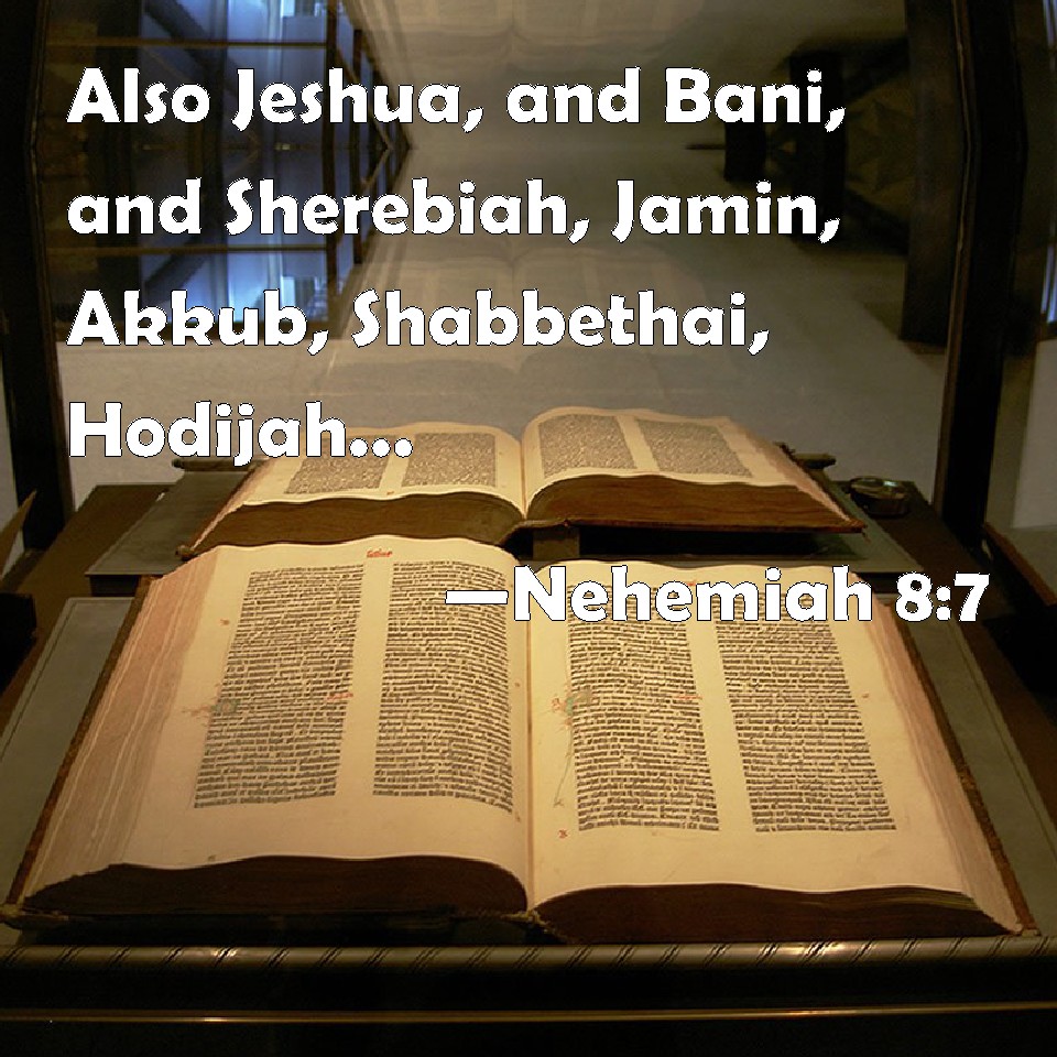 Choose a Background Nehemiah 8:7 Also Jeshua, and Bani, and Sherebiah, Jamin, Akkub, Shabbethai, Hodijah, Maaseiah, Kelita, Azariah, Jozabad, Hanan, Pelaiah, and the Levites, caused the people to understand the law: and the people stood in their place. KJV: Also Jeshua, and Bani, and Sherebiah, Jamin, Akkub, Shabbethai, Hodijah, Maaseiah, Kelita, Azariah, Jozabad, Hanan, Pelaiah, and the Levites, caused the people to understand the law: and the people stood in their place. DRB: Now Josue, and Bani, and Serebia, Jamin, Accub, Sephtai, Odia, Maasia, Celtia, Azarias, Jozabed, Hanan, Phalaia, the Levites, made silence among the people to hear the law: end the people stood in their place. DBT: And Jeshua, and Bani, and Sherebiah, Jamin, Akkub, Shabbethai, Hodijah, Maaseiah, Kelita, Azariah, Jozabad, Hanan, Pelaiah, and the Levites, caused the people to understand the law; and the people stood in their place. ERV: Also Jeshua, and Bani, and Sherebiah, Jamin, Akkub, Shabbethai, Hodiah, Maaseiah, Kelita, Azariah, Jozabad, Hanan, Pelaiah, and the Levites, caused the people to understand the law: and the people stood in their place. WBT: Also Jeshua, and Bani, and Sherebiah, Jamin, Akkub, Shabbethai, Hodijah, Maaseiah, Kelita, Azariah, Jozabad, Hanan, Pelaiah, and the Levites, caused the people to understand the law: and the people stood in their place. WEB: Also Jeshua, and Bani, and Sherebiah, Jamin, Akkub, Shabbethai, Hodiah, Maaseiah, Kelita, Azariah, Jozabad, Hanan, Pelaiah, and the Levites, caused the people to understand the law: and the people [stood] in their place. YLT: And Jeshua, and Bani, and Sherebiah, Jamin, Akkub, Shabbethai, Hodijah, Maaseiah, Kelita, Azariah, Jozabad, Hanan, Pelaiah, and the Levites, giving the people understanding in the law, and the people, are on their station,Links Nehemiah 8:7 NIV • Nehemiah 8:7 NLT • Nehemiah 8:7 ESV • Nehemiah 8:7 NASB • Nehemiah 8:7 KJV • Nehemiah 8:7 Interlinear • Nehemiah 8:7 Commentaries • Nehemiah 8:7 Parallel Texts • Nehemiah 8:7 Bible Apps • Nehemiah 8:7 Parallel • Bible Hub |