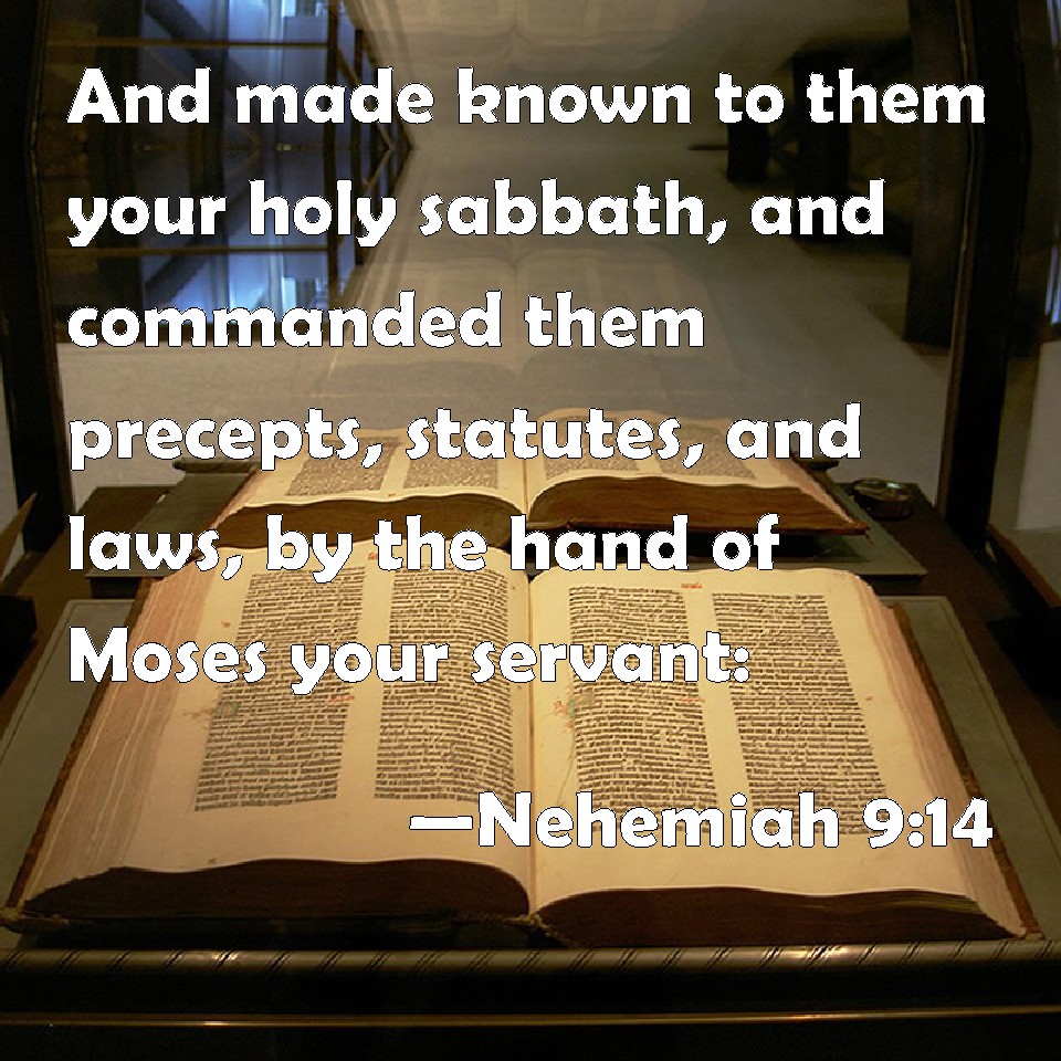Choose a Background Nehemiah 9:14 And made known to them your holy sabbath, and commanded them precepts, statutes, and laws, by the hand of Moses your servant: KJV: And madest known unto them thy holy sabbath, and commandedst them precepts, statutes, and laws, by the hand of Moses thy servant: DRB: Thou madest known to them thy holy sabbath, and didst prescribe to them commandments, and ceremonies, and the law by the hand of Moses thy servant. DBT: And thou madest known unto them thy holy sabbath, and prescribedst for them commandments and statutes and a law, through Moses thy servant. ERV: and madest known unto them thy holy sabbath, and commandedst them commandments, and statutes, and a law, by the hand of Moses thy servant: WBT: And madest known to them thy holy sabbath, and commandedst them precepts, statutes, and laws, by the hand of Moses thy servant: WEB: and made known to them your holy Sabbath, and commanded them commandments, and statutes, and a law, by Moses your servant, YLT: And Thy holy sabbath Thou hast made known to them, and commands, and statutes, and law, Thou hast commanded for them, by the hand of Moses Thy servant;Links Nehemiah 9:14 NIV • Nehemiah 9:14 NLT • Nehemiah 9:14 ESV • Nehemiah 9:14 NASB • Nehemiah 9:14 KJV • Nehemiah 9:14 Interlinear • Nehemiah 9:14 Commentaries • Nehemiah 9:14 Parallel Texts • Nehemiah 9:14 Bible Apps • Nehemiah 9:14 Parallel • Bible Hub |